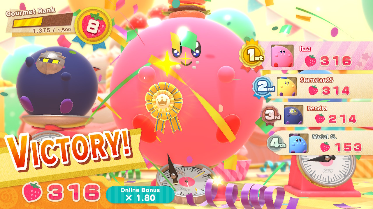 There is a replayability factor to this but I can easily see why people would get tired of the game. Like I said, the gameplay is super simple and the games consist of the same four rounds each time so it can start to feel repetitive. When I first bought the game I admit I was absolutely addicted to it and played it hours on end, but I actually haven’t gone back to the game in awhile what with other games taking my attention away from it. And I did notice a dip in players after the initial few days of release. I do like this game and it’s cute but I know it can be a forgettable one too. It’s neat that they made another Kirby game for his anniversary and I loved the positive reactions it got, but I think it might be forgotten like the Kirby fighting game from awhile ago. I would hope that HAL or Nintendo would update the game and just do something with it. It’s been a few months with nothing so I’m a little worried because it’s a shame. Something like more cosmetics, but more importantly different modes. I’m not sure what else they can add but something like a new mode would be enticing. As it is right now, Kirby’s Dream Buffet is a sweet game with some fun to be had but maybe a little lacking. I wouldn’t say I regret getting it, but I still believe the game should have been cheaper or at least another “free” game in the Nintendo premium subscription.