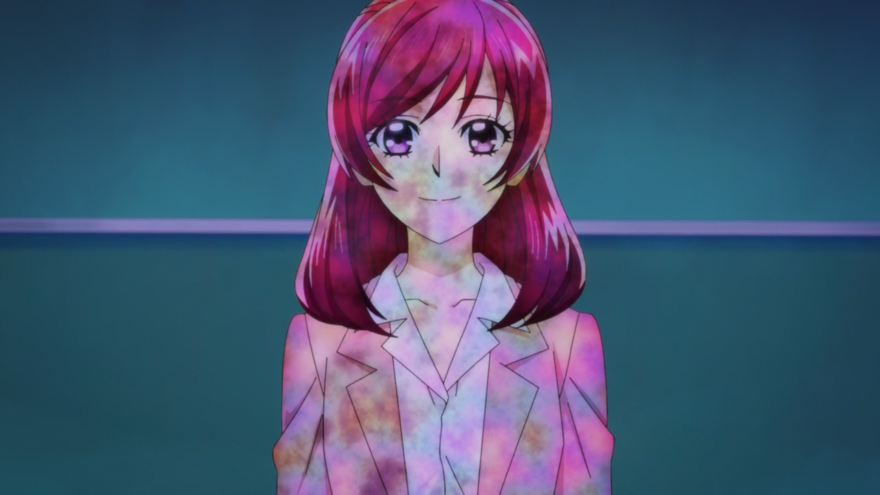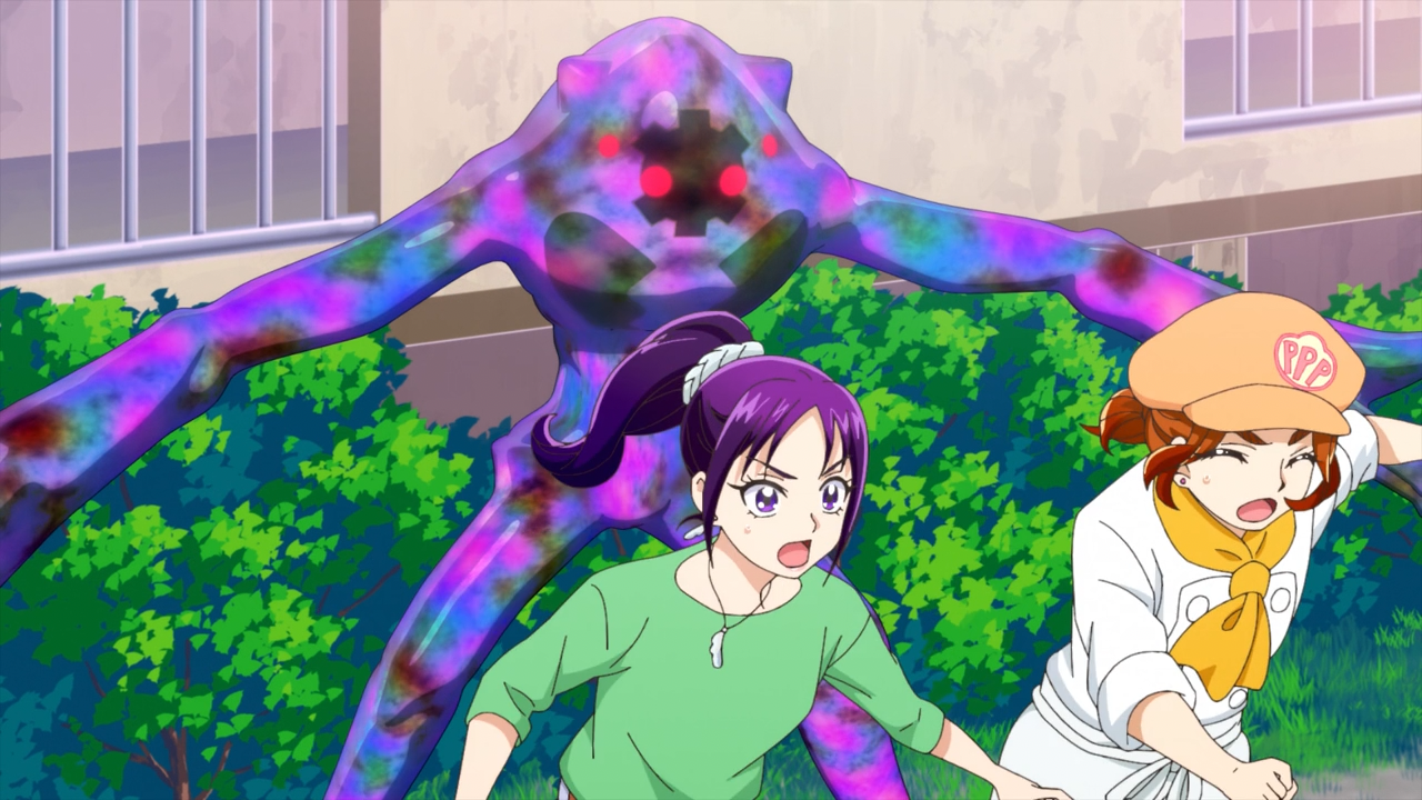 Surprisingly there was no transformation from these two this episode, nor did they defeat the shadows, but man the sloppy and careless consideration for the scene made me facepalm. I mean seriously: What was the point of having Kurumi call Nozomi to come and help her save Saki and Mai, only for them to be riding Syrup and making a quick getaway? I mean, this was just so stupid on so many levels because I don’t know what Kurumi’s schedule is like, but calling Nozomi while she’s at work–and having her tag along for this sort of thing was just so thoughtless on so many levels. And lo and behold, she ends up returning late and getting into trouble, and how does she react? “Ehe!” Unacceptable! Nozomi is not a kid nor a student anymore, she’s a teacher– so she sure as heck shouldn’t have that sort of attitude for returning late to class that she’s supposed to be instructing! I don’t know why the writers thought they absolutely needed Nozomi there, because they didn’t do her any favours in doing so!