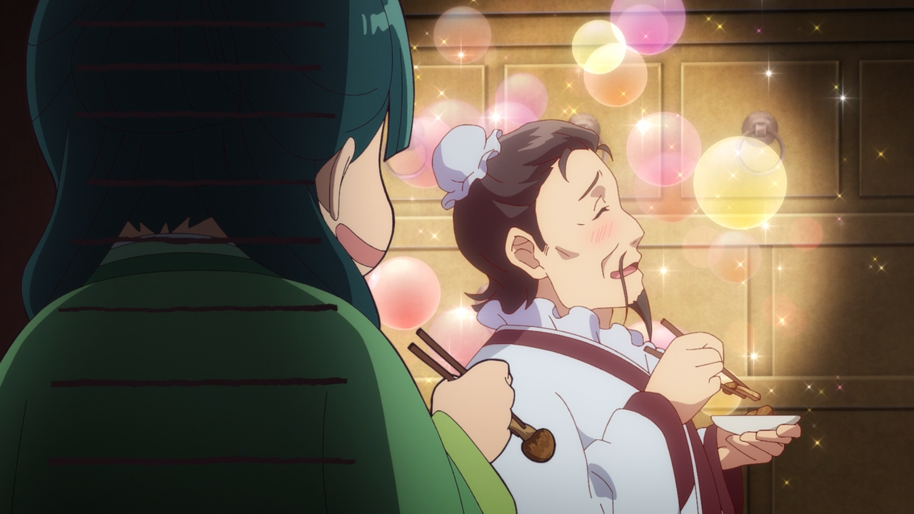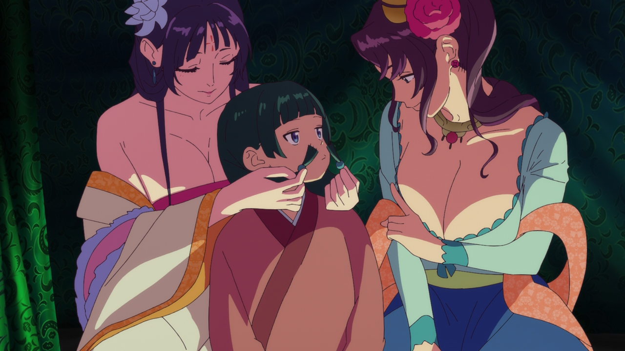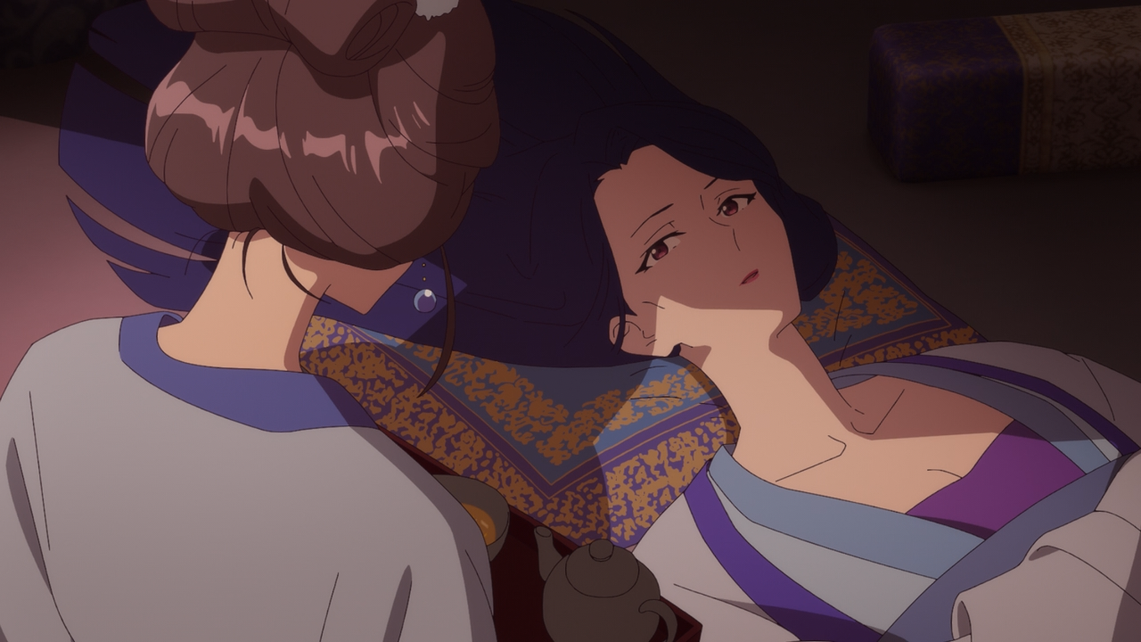 After all said and done, it was great that Lady Lihua was able to make full recovery, especially since in the beginning Maomao had to take care of her for most part on her own and you could see how deadass exhausted she was. It was very sweet to see Lady Lihua caressing her head when she had dozed off, a sweet gesture of appreciation of her efforts. With Lady Lihua mostly recovered, Maomao is due to return to Lady Gyoukuyou’s side, but not before sharing a generous secret technique she has learned from the sisters she served at the brothel. Oh my god, I was wheezing from laughing so hard. The way Maomao just drops these things with a deadpan face cracks me up every time!