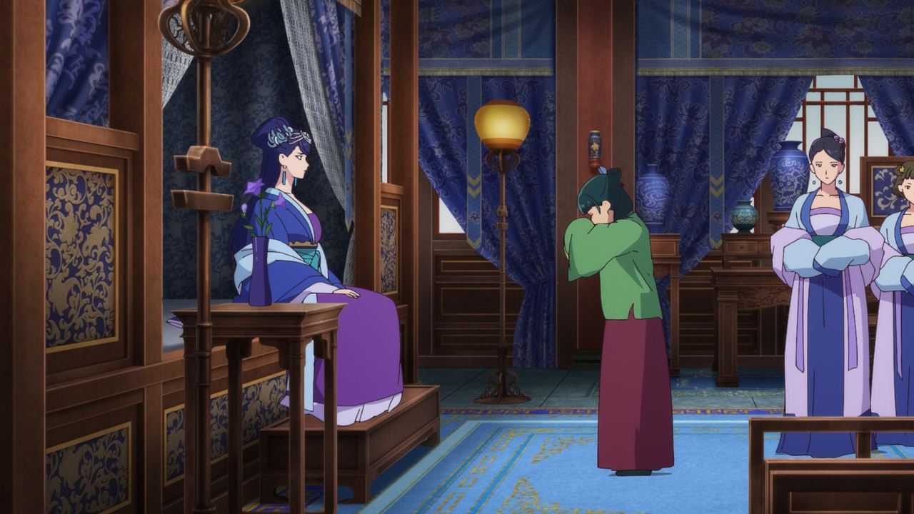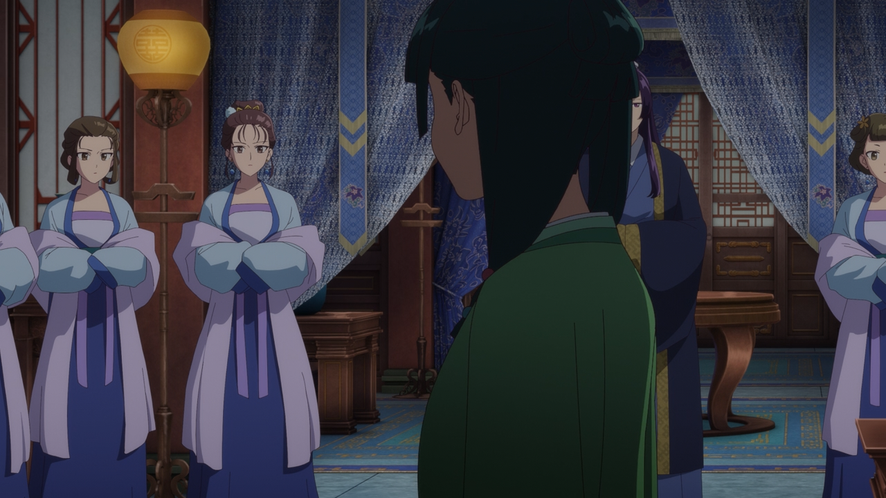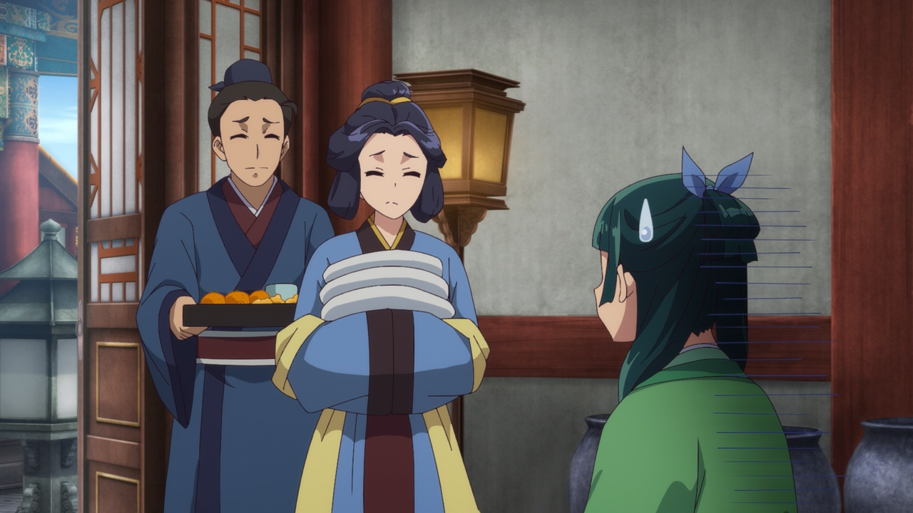 The anime looks toned down than the manga at the part when Maomao put that arrogant lady-in-waiting in her place. But nevertheless, it’s still very satisfying to watch Maomao finally snapped at them for their negligence and carelessness. One of my favorite moments for sure! If I recall it right, that lady-in-waiting seems to have an influential father or something, so maybe that’s why she got lighter punishment.