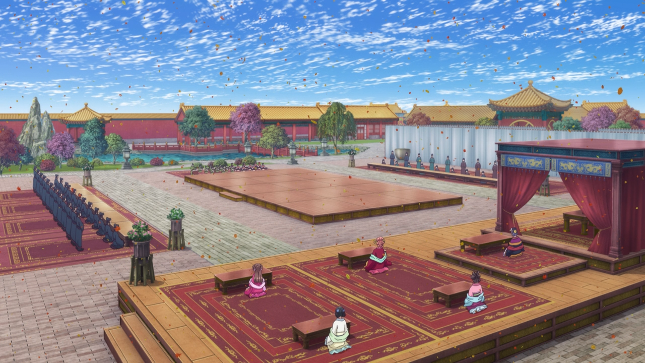 The Garden Party an event that is held twice a year where the emperor and high official gather in the garden for entertainment. As he has no empress yet, it’s customary to bring the upper first rank concubines (the four best contenders). Among them are: The Precious Concert Gyoukuyou, the Wise Consort Lihua, the Virtuous Consort Lishu, and the Pure Consort Ah-Duo.