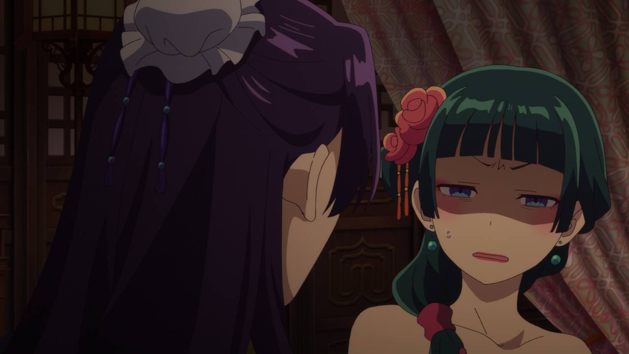 For Jinishi, it was a bit more complicated because he thought being in the Rear Palace made Maomao unhappy. Contrary to Gaoshun’s beliefs that she was merely a convenient pawn, Jinishi didn’t want to force her to have to stay if she didn’t want to, so even though it pained him to be separated from her, he thought it would be in her best interest to let her go. However contrary to what he thought, Maomao came to realize that she actually enjoyed her time working under Lady Gyokuyou, especially since she gets to be a poison taster. But as we all know, communicating her desires is not exactly Maomao’s strong suit so to speak. Much of it has to do with being incredibly conscious of her position as a commoner, and abiding the rules so she wouldn’t get into trouble. However as result of saying she’ll do whatever she is “ordered” to do, she isn’t able to properly communicate to Jinshi that it’s her true will to stay. Instead everything she should’ve said out loud “please don’t fire me” was internalized in her head. And thus her negotiations had failed.