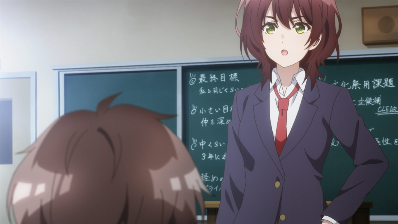 And on another note, I noticed that the translator likely screwed up the translation again. On the blackboard for the small goal, it read: “Who do you want to get closer to?” but Aoi said, “I need your answer soon. At least 2 girls you’d like to date.” Again, these things do not necessarily follow one another, and it suggests that the translator carried over the botched translation from Episode 6 to this one. This translator truly sucks.
