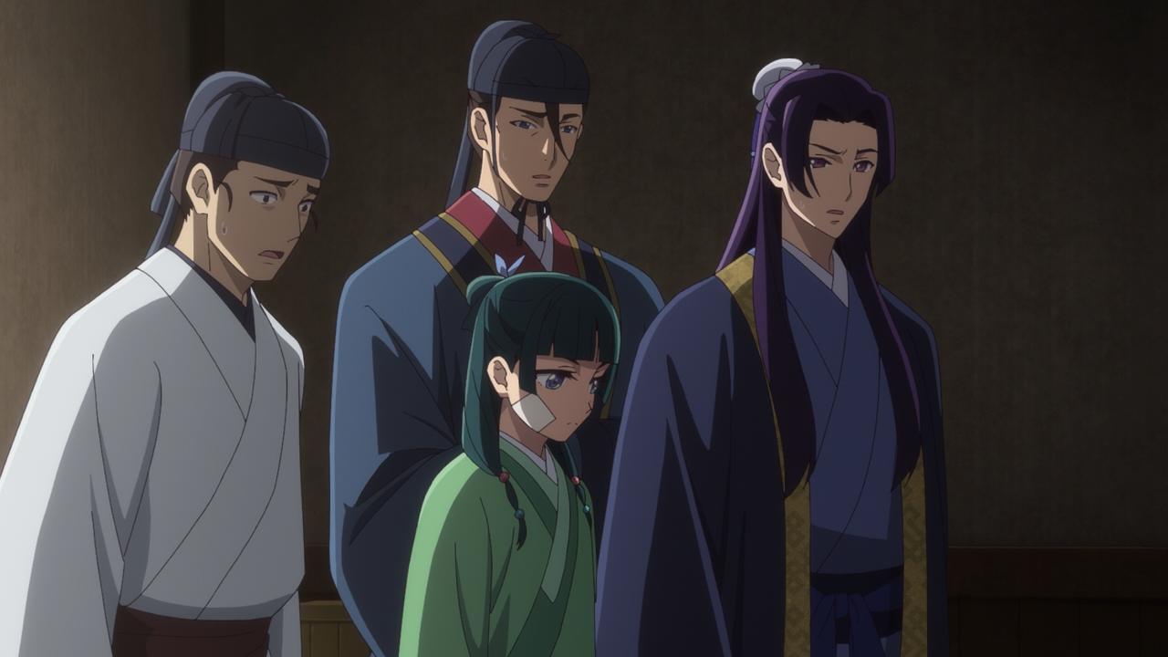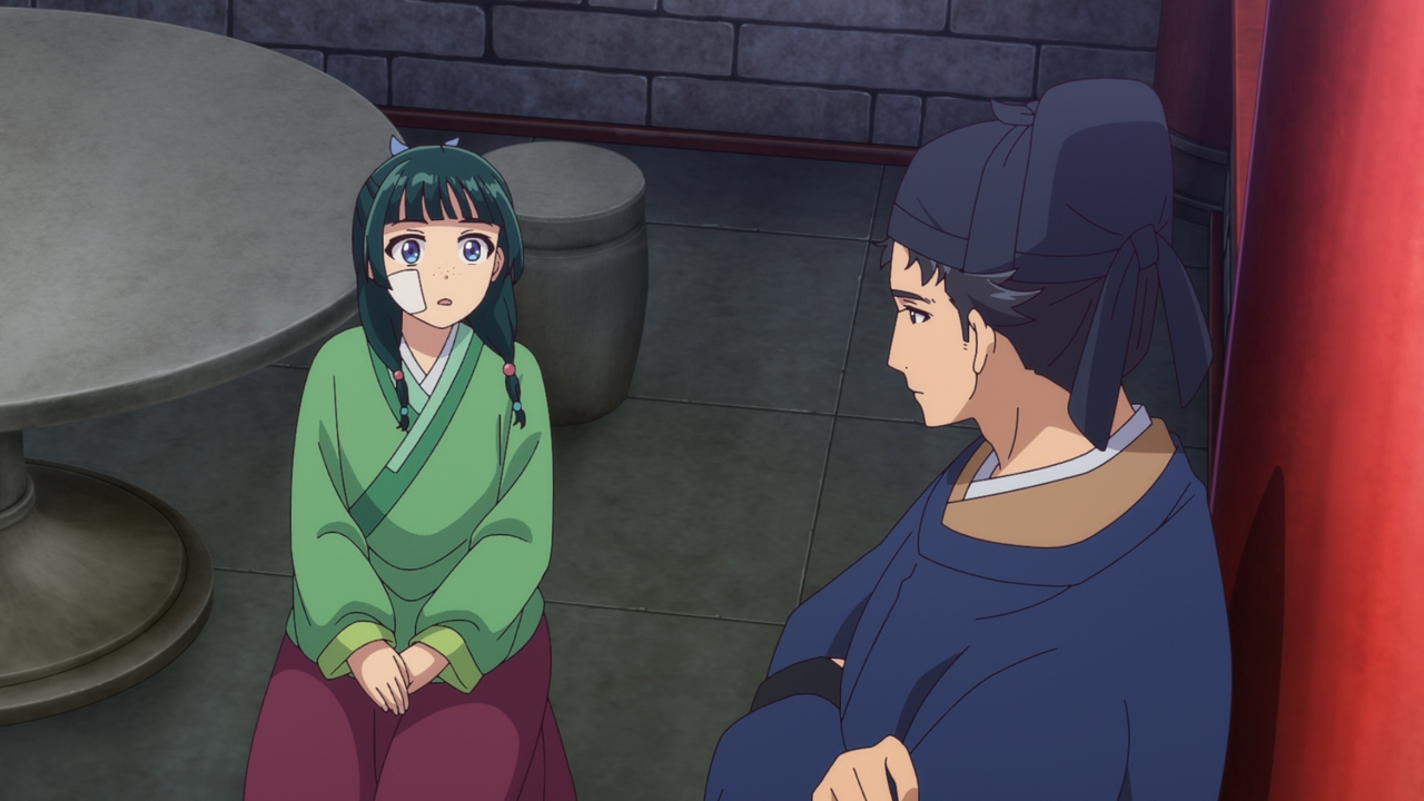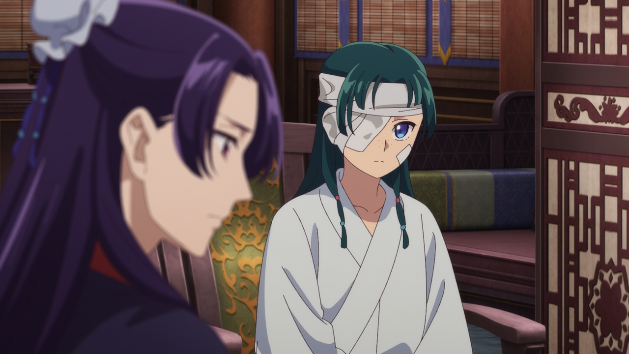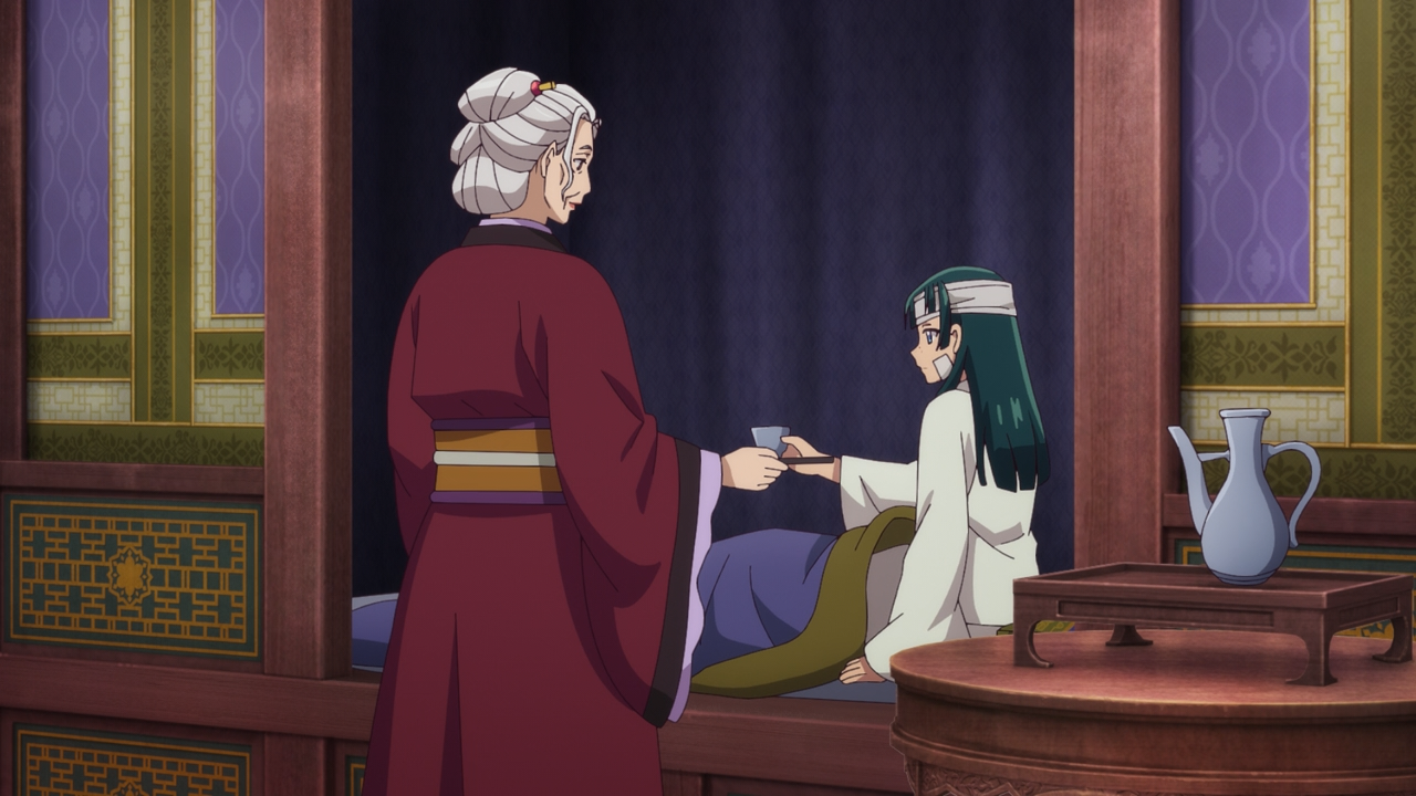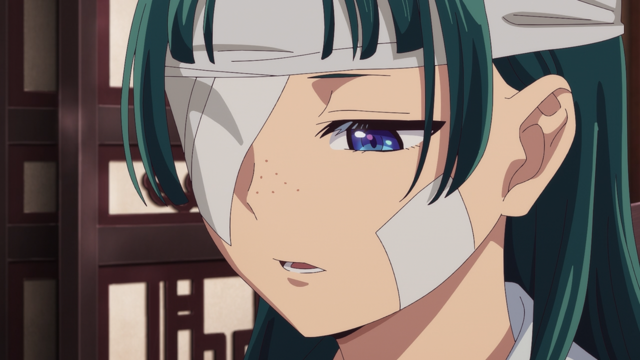 After Maomao’s heroic save, Jinshi certainly gave her the best of the best by choosing to have her recover in his room, in his comfy bed instead of being stuck in the infirmary. That leg injury resulted fifteen stitches, and a battered face had her head wrapped. After she woke up they went on to discuss how she was able to piece together the attempted assassination on him. The officials who overseen the Ceremonial affairs were targeted deliberately (one dead, another in a coma), the tools to manage the ceremony were stolen, so they had to be replaced, only this time with inferior pieces. The metal pieces were designed with the intention to break, suggesting the culprit knew about the craftsman’s technique of melting metals, which was used for the puzzle he had left behind for his sons to solve. Maomao made a point that the youngest son, who had been tasked with creating the replacement pieces was likely unaware of what he had been tasked with, and merely remade the tools as instructed, and thus exploited.
