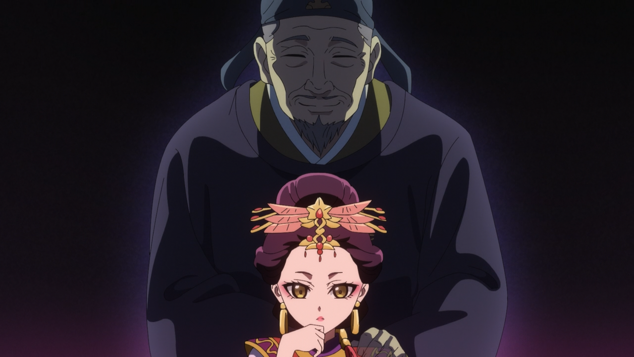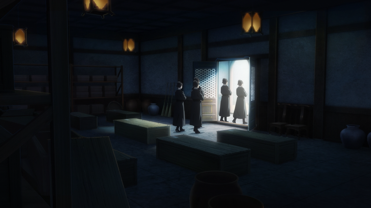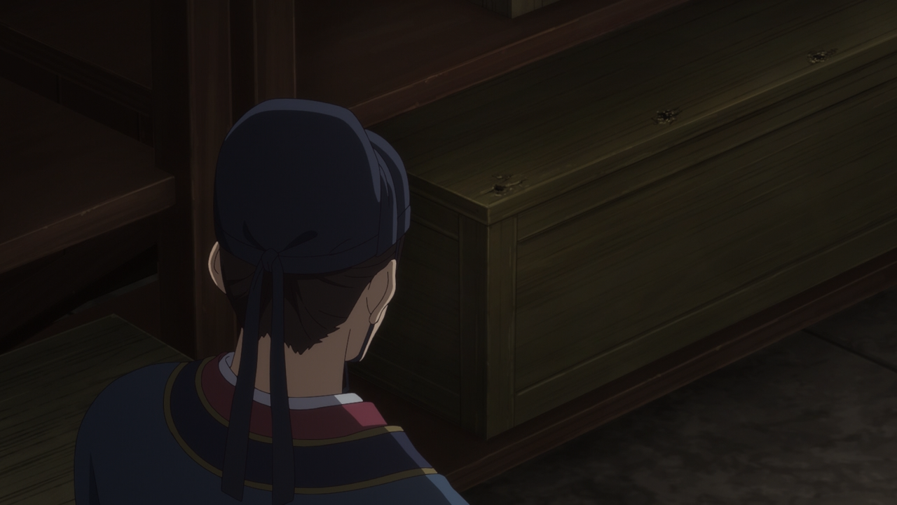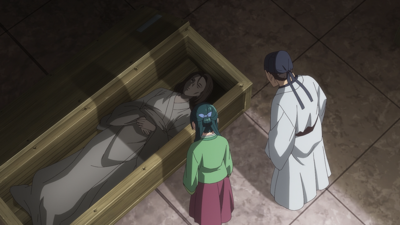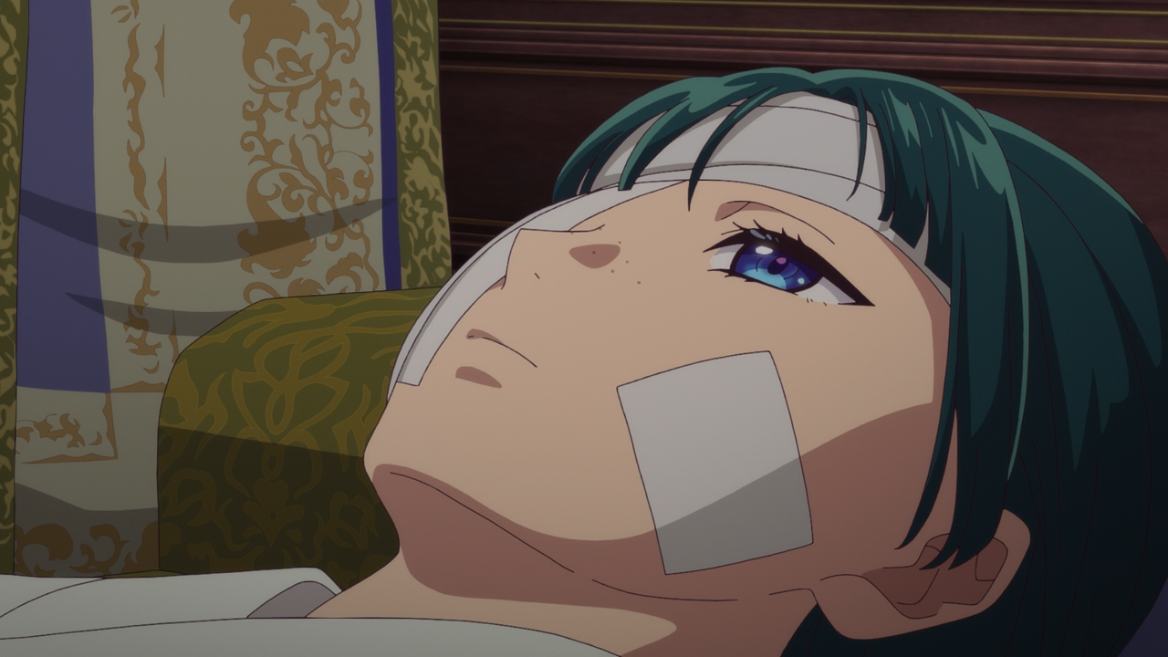 After Maomao’s heroic save, Jinshi certainly gave her the best of the best by choosing to have her recover in his room, in his comfy bed instead of being stuck in the infirmary. That leg injury resulted fifteen stitches, and a battered face had her head wrapped. After she woke up they went on to discuss how she was able to piece together the attempted assassination on him. The officials who overseen the Ceremonial affairs were targeted deliberately (one dead, another in a coma), the tools to manage the ceremony were stolen, so they had to be replaced, only this time with inferior pieces. The metal pieces were designed with the intention to break, suggesting the culprit knew about the craftsman’s technique of melting metals, which was used for the puzzle he had left behind for his sons to solve. Maomao made a point that the youngest son, who had been tasked with creating the replacement pieces was likely unaware of what he had been tasked with, and merely remade the tools as instructed, and thus exploited.