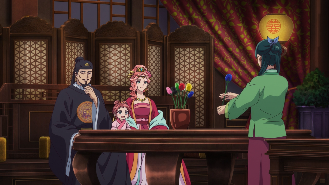 Ahem, this week Lakan has come with a new challenge to Jinshi and Maomao, and this time it’s preparing Blue Roses for the upcoming Garden Party in a month’s time. The problem however is that roses aren’t in season for another two months, and most florists didn’t know how to create the legendary blue roses that was once seen on the palace grounds. Jinshi had been working tirelessly to find an answer without Maomao, mainly because he didn’t really want her to have to deal with Lakan’s riddles again. But this time, it was Maomao who rose to the challenge when she saw how exhausted Jinshi was, and heard that it was Lakan’s doing. But she wasn’t going to do it for the sake of it, this time she has a plan to strike back.