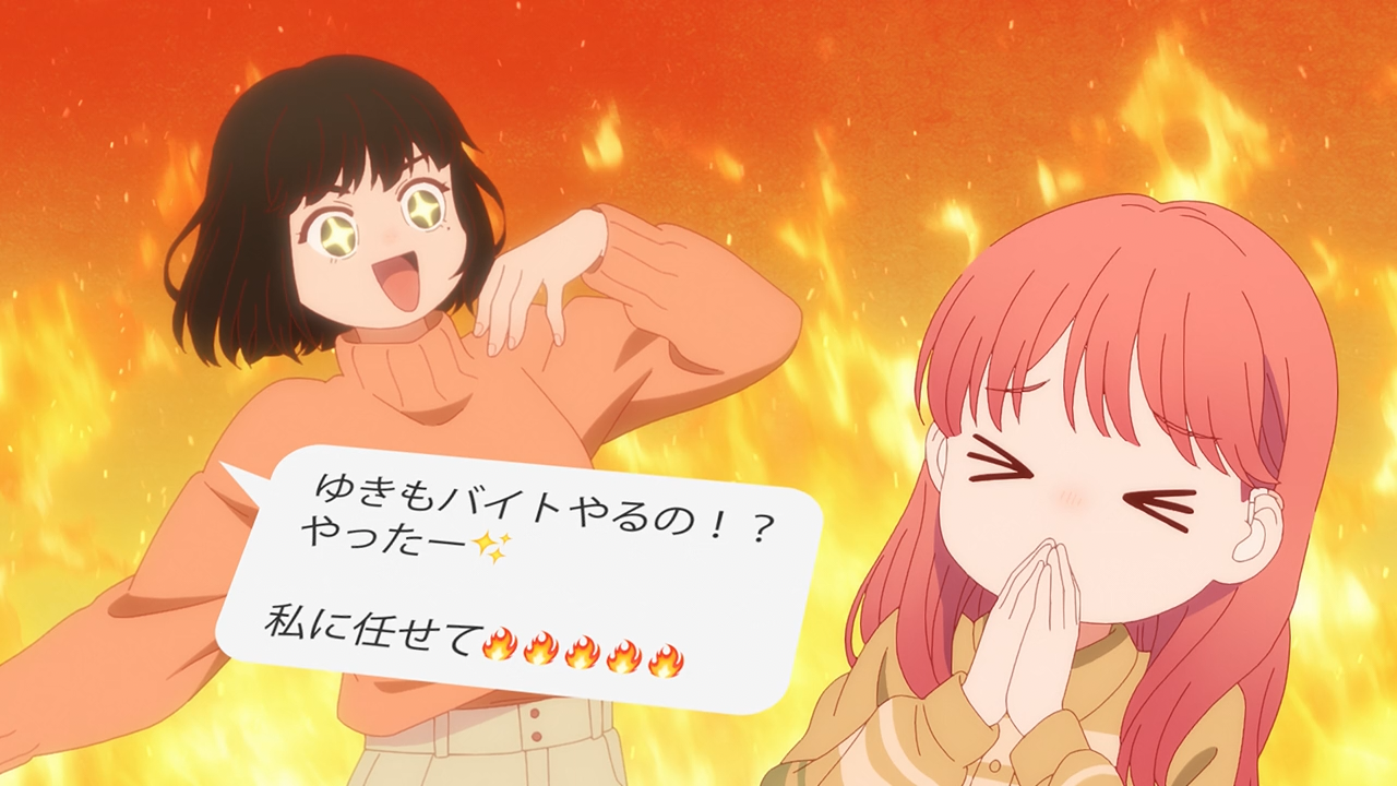 Speaking of our love birds, Yuki’s definitely feeling the pressure at the moment of trying to find a job. She’s been waiting for her friend to get back on her for some more suggestions. So I’m glad Itsuomi has noticed and even apologized for unintentionally making her feel she needs to hurry. It was cute to see them actually carry on with the pinching cheeks communication tactic for when they want to kiss the other.