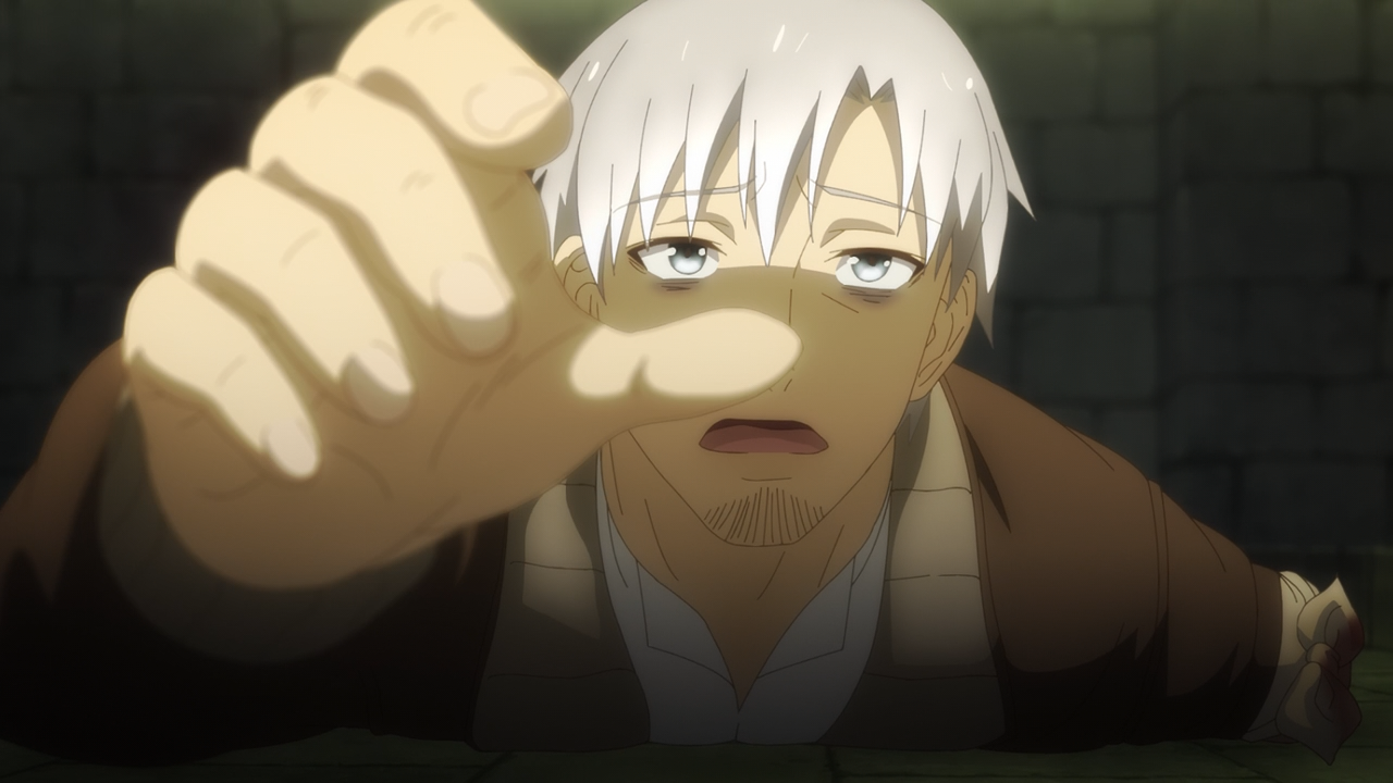 Although they had managed to securely get Holo out of Medio Trading’s custody, the problem was that they were still being pursued and were eventually traced down to be hiding under the city. Unfortunately they did get surrounded after running into a dead end where the ‘exit’ Holo had thought she smelled turned out to be an abandoned well. And to make matters worse, Lawrence got badly wounded along the way, so bad that he was losing a lot of blood and barely able to stand, let alone stay conscious. Still, gotta hand it to the guy for his determination to protect Holo till the very end, because he still took out his dagger, ready to fight despite being clearly outnumbered. At that point since they had their backs to the wall, Holo took her true form again.