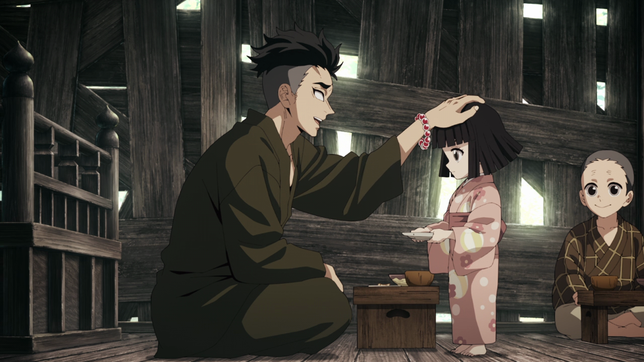 I definitely liked this episode more since it was character focused rather than training. We finally get some light on where Gyomei is coming from as a person and a demon slayer and just like the majority of the Hashira, has a tragic backstory. It’s hard for me to tell whether or not I’m just used to having all the characters in this series have sad pasts or if it’s because of the pacing, but Gyomei’s backstory didn’t hit me as hard as it should have. Though I do think part of it had to do with it just coming out of seemingly no where once Tanjiro. Especially since Gyomei didn’t really interact with Tanjiro up until this moment so it did feel like it came out of nowhere without proper build up. Especially since we only found out about Gyomei’s disdain towards children at the same time of his flashback. Makes me wish we got to see and interact with him more before we got his backstory.