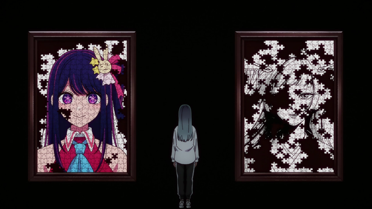 We jump right into the preparations for the stage play and already, we are treated to a spectacle. I absolutely loved the symbolism of those who are gifted and passionate about acting where they are shown in a vibrant color while the rest are grayed out. And the detail on how Kana does her acting jobs, at first she’s shining, but then purposefully dulls herself to match those around her. Only for Himekawa to douse her with the reality that she CAN act her heart out because he will be able to match her blow for blow. And man, that shot of Kana getting hit with color while half of her is the character… UGH IT WAS SO GOOD. Especially with how the two of them were shining so brightly while dousing the room with color. And man, I loved hearing unhinged Kana lol. The fact that someone is able to allow her to go all out after so long must feel so revitalizing to her. Even Aqua seemed awed by Himekawa’s performance if only for a moment. That whole sequence was just so good with the cinematography, the voice acting, the colors… I just keep replaying it because it was so good.