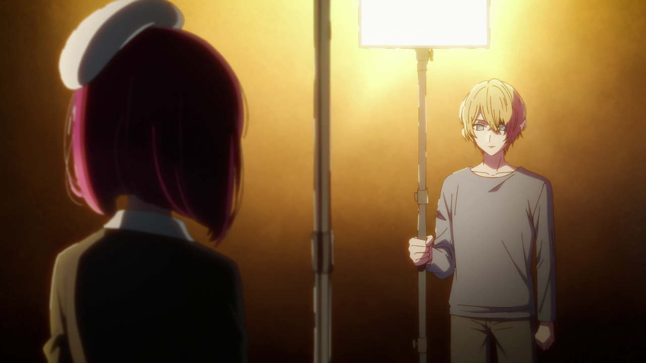 I feel like Aqua makes me go back and forth between shipping him with Kana, to this man cannot function in a healthy relationship and desperately needs therapy. One moment he’s just showing how supportive he is of Kana and allowing her to not worry about her fears because he’s there to back her up. And then the next he is exhibiting very concerning behaviors that would not do well in a relationship. His moment with Kana was very adorable, even if their montage of their time together did drag on a little too long for my liking. Especially since it feels like he’s constantly bringing the best out of her. But due to his extreme survivor’s guilt and his hellbent lust for revenge, it’s hard to allow myself to fully ship them because of how messed up he is. Everyone is trying to work through their inner-demons, but Aqua’s is so deeply rooted in his soul that he can’t allow himself any form or happiness. He has so much emotional baggage and is putting all his effort into the wrong places. Not gonna lie, but the aspect of him viewing acting as “not fun” and “painful” felt a tad silly to me. On a fundamental level, I get it since it contrasts with how fun acting is with the others. But in concept it breaks my suspension of disbelief a little. Though it’s definitely tragic. Especially since we just had an episode with Melt expressing how much fun acting is to Aqua.