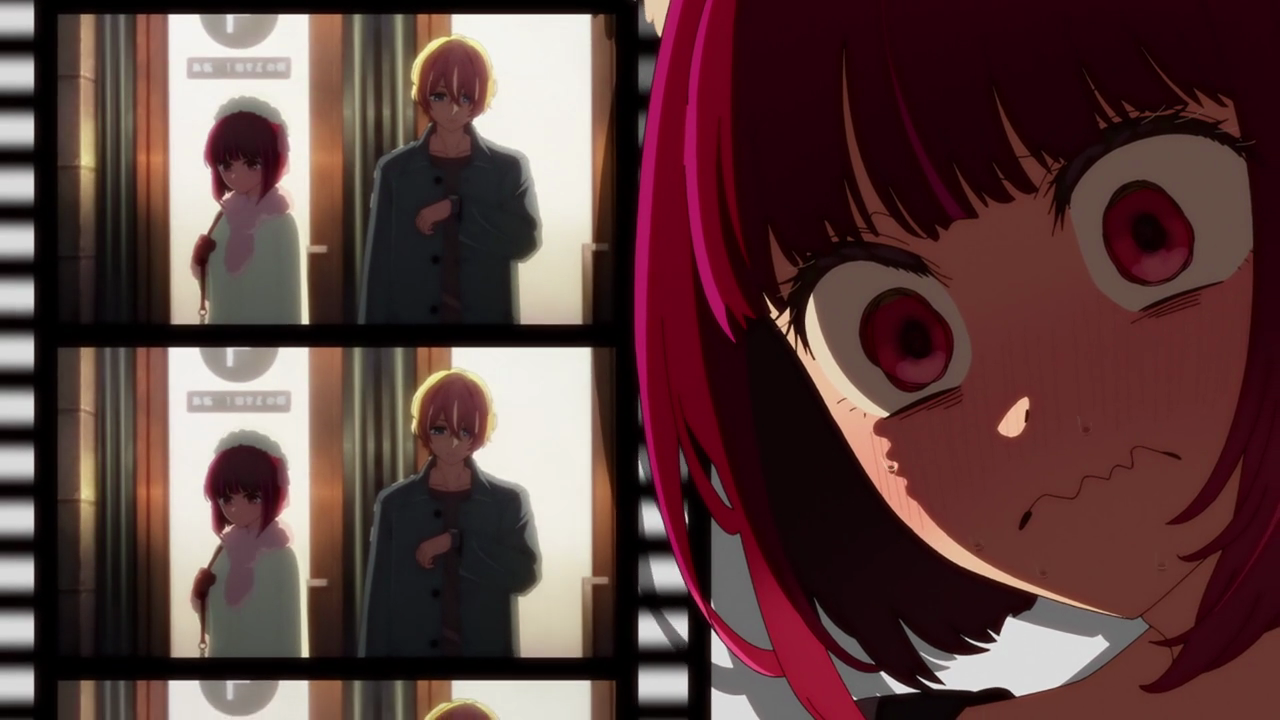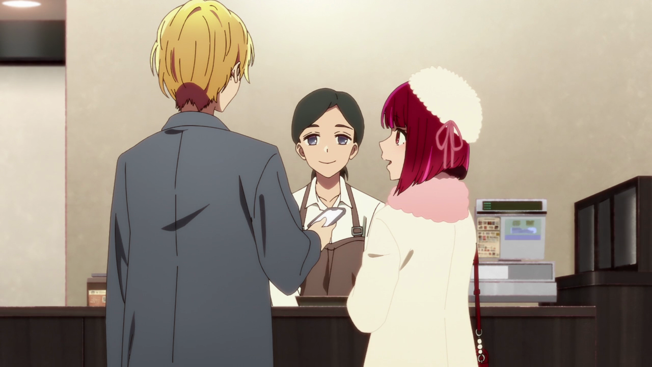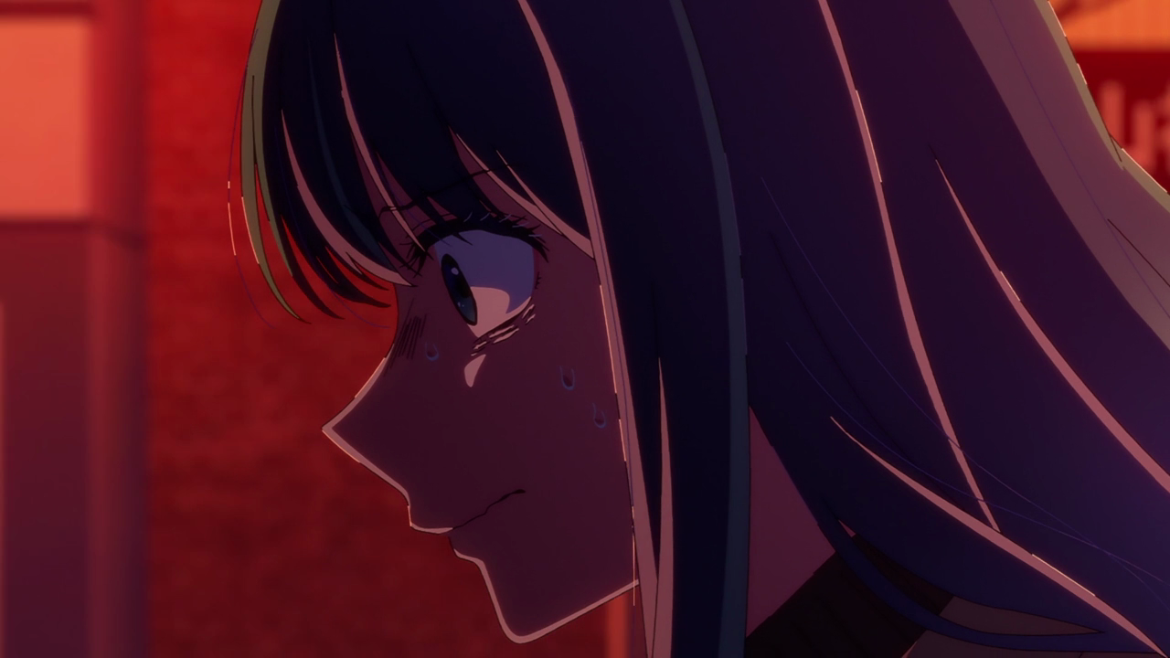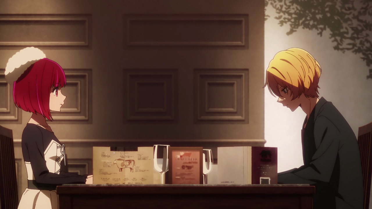 Also I really like the symbolism of the shot of Kana and Aqua sitting across each other at the table. It kind of reminds me of a similar shot in Idolish7 where it was shown that one of the characters had a bunch of stuff on their side of a wall since they had a lot to work for while the other character had a blank slate on their side indicating that he was empty and lack of an actual drive. This also applies to Kana and Aqua respectively as Kana has built up a lot of things in her career and has so much to work towards while Aqua doesn’t know what to do after being set free from his revenge. Though there is still a looming shadow in the backdrop there… However, instead of it being split equally on both sides, Kana’s side is overwhelmingly larger than Aqua’s. Almost as if he wants to cross over onto her side as she has so much to offer but it still hesitant because of so many factors.