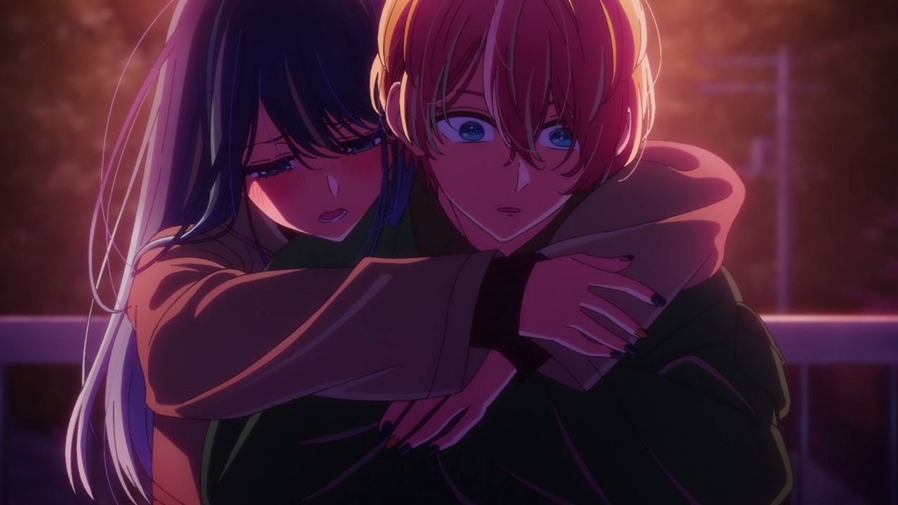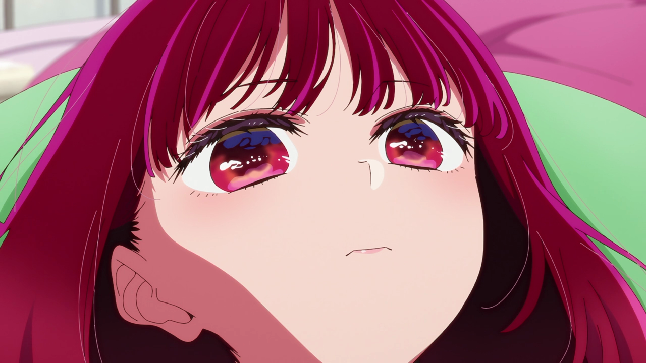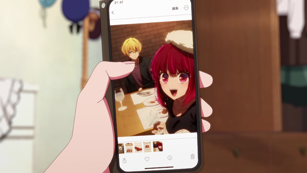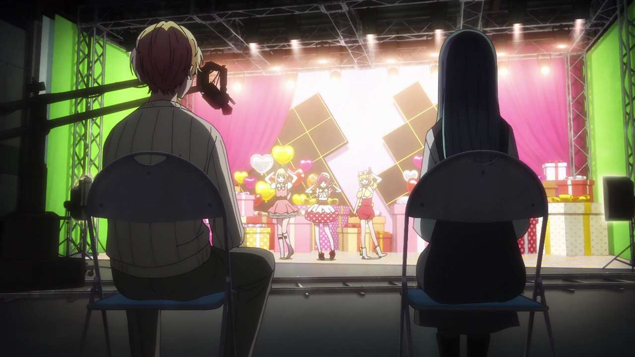 Also I really like the symbolism of the shot of Kana and Aqua sitting across each other at the table. It kind of reminds me of a similar shot in Idolish7 where it was shown that one of the characters had a bunch of stuff on their side of a wall since they had a lot to work for while the other character had a blank slate on their side indicating that he was empty and lack of an actual drive. This also applies to Kana and Aqua respectively as Kana has built up a lot of things in her career and has so much to work towards while Aqua doesn’t know what to do after being set free from his revenge. Though there is still a looming shadow in the backdrop there… However, instead of it being split equally on both sides, Kana’s side is overwhelmingly larger than Aqua’s. Almost as if he wants to cross over onto her side as she has so much to offer but it still hesitant because of so many factors.
