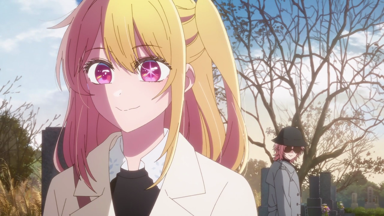 I don’t particularly support Ruby’s strong romantic feelings for Goro due to the age difference, but I can understand why she has such a strong attachment to him. Considering from the sounds of it, her own parents didn’t even visit that often. Which left Goro as the only person to really make time to bond with her and made her days at the hospital memorable and as pleasant as he could. I do also think it’s sweet that Ruby named her group B-Komachi partly to try and meet with Goro again. But as soon as she dropped that he was the reason to live, I felt an incredible sinking feeling. Considering we knew Goro was already dead and nothing good would come of her finding out about it. And of course, she finds out. And probably in the most horrifying way possible by finding his freaking skeleton. The body was definitely moved as he died at the bottom of the cliff but is now behind a shrine. It’s probably easy to conclude that the stalker must have hidden it to avoid getting caught. Which was probably why he is still considered missing as I feel like a dead body at the bottom of a cliff would have been found eventually. But man, seeing the light disappear from her star eye was incredibly sad and also worries me as to what will happen to her now. A part of me wants Aqua to tell her that he’s Goro to reassure her, but another part of me fears what would happen if he did…