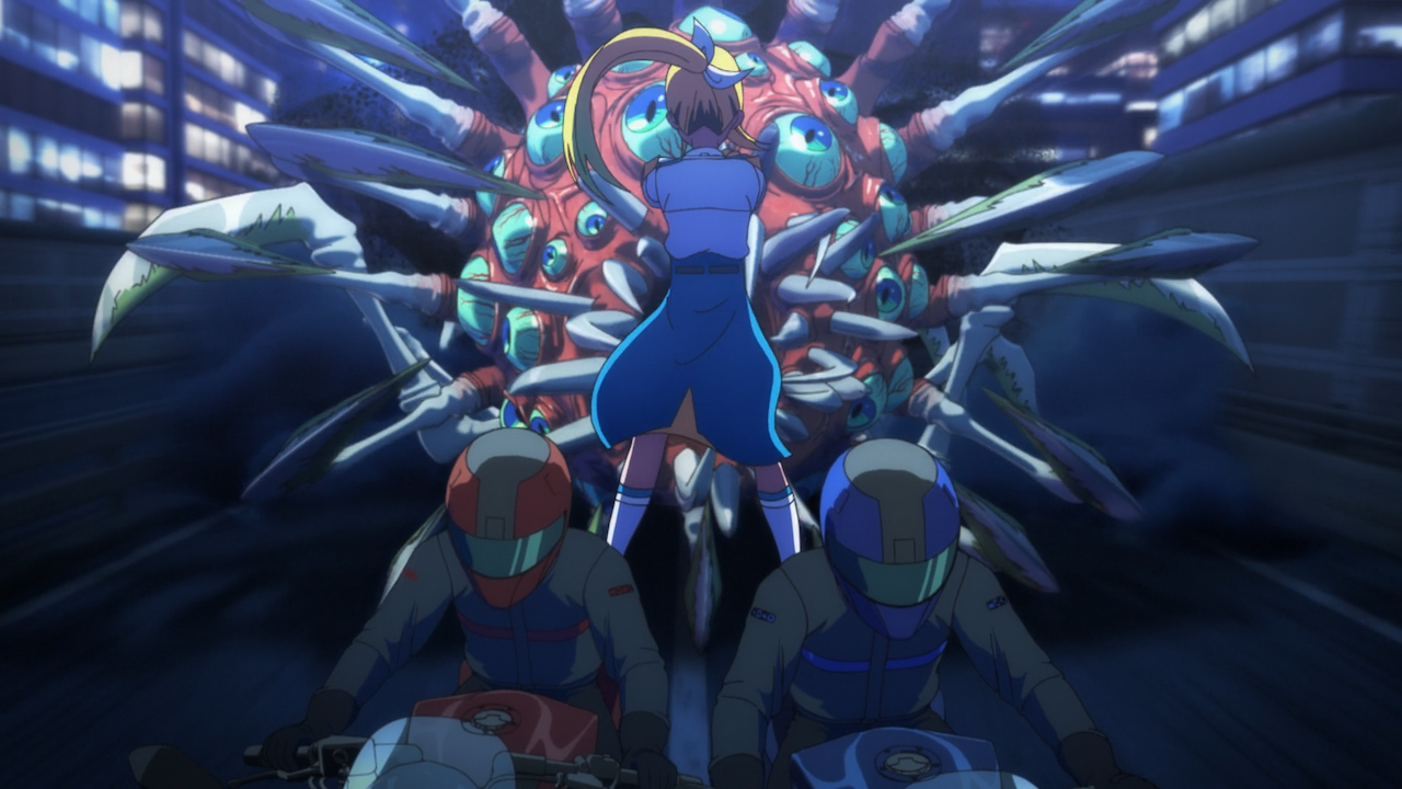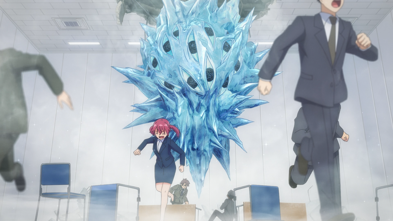 Today we got to see two large and problematic Kaii. The first one being an eye-bally monster during a highway chase– and then a Frostoid. When a Kaii is left alone for too long, they can grow too much and powerful and that’s when they need more than one magical girl at the scene (unless they just happen to be super OP, but we’ve yet to meet one who has such talent). Both occasions prompted Koshigaya Hitomi, who typically does her jobs solo because she’s the only magical girl unit at the company, have to do the ill-advised, of seeking assistance from regular civilians. The first instance in the beginning of the episode was because the highway one ate her freaking BROOM,so she had to rely on two gutsy motorists to be her ride. The other, the Frostoid, was just too powerful to manage on her own, and they simply could not afford to wait thirty minutes for reinforcements from another company. So she had to asked for volunteers to assist her, and that’s where Kana stepped in.