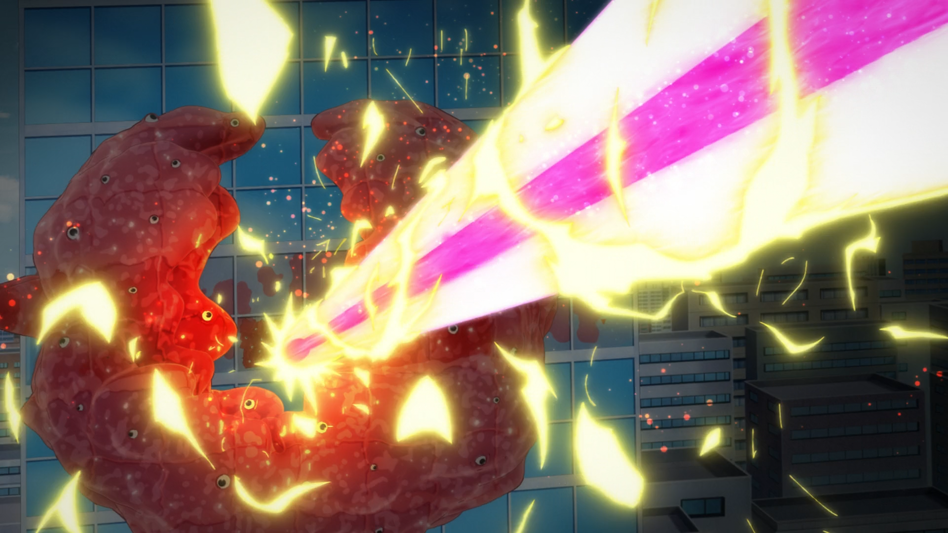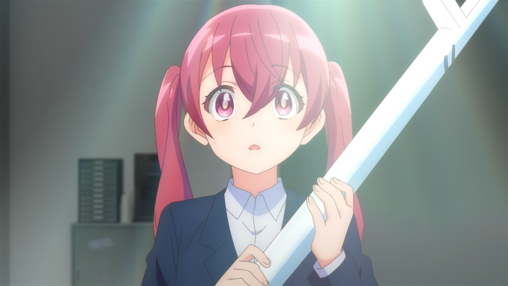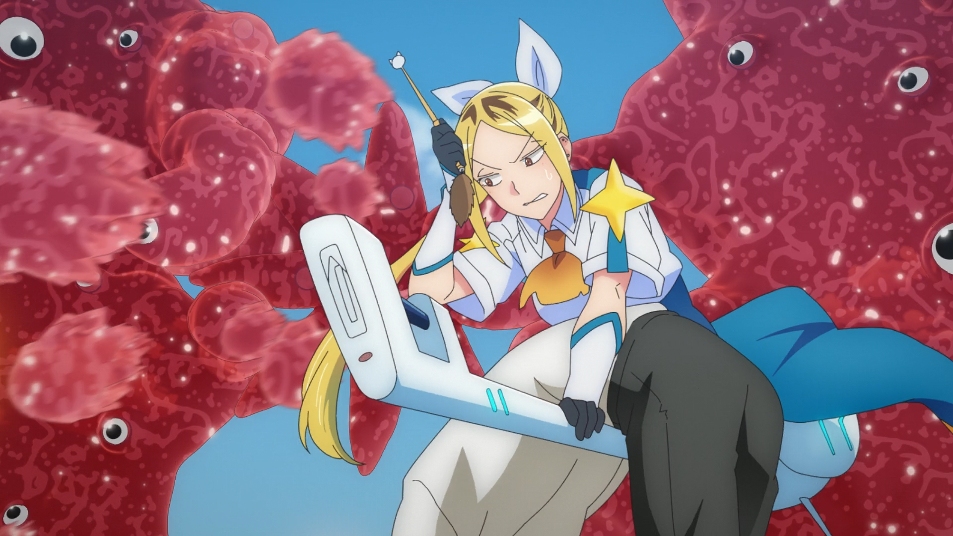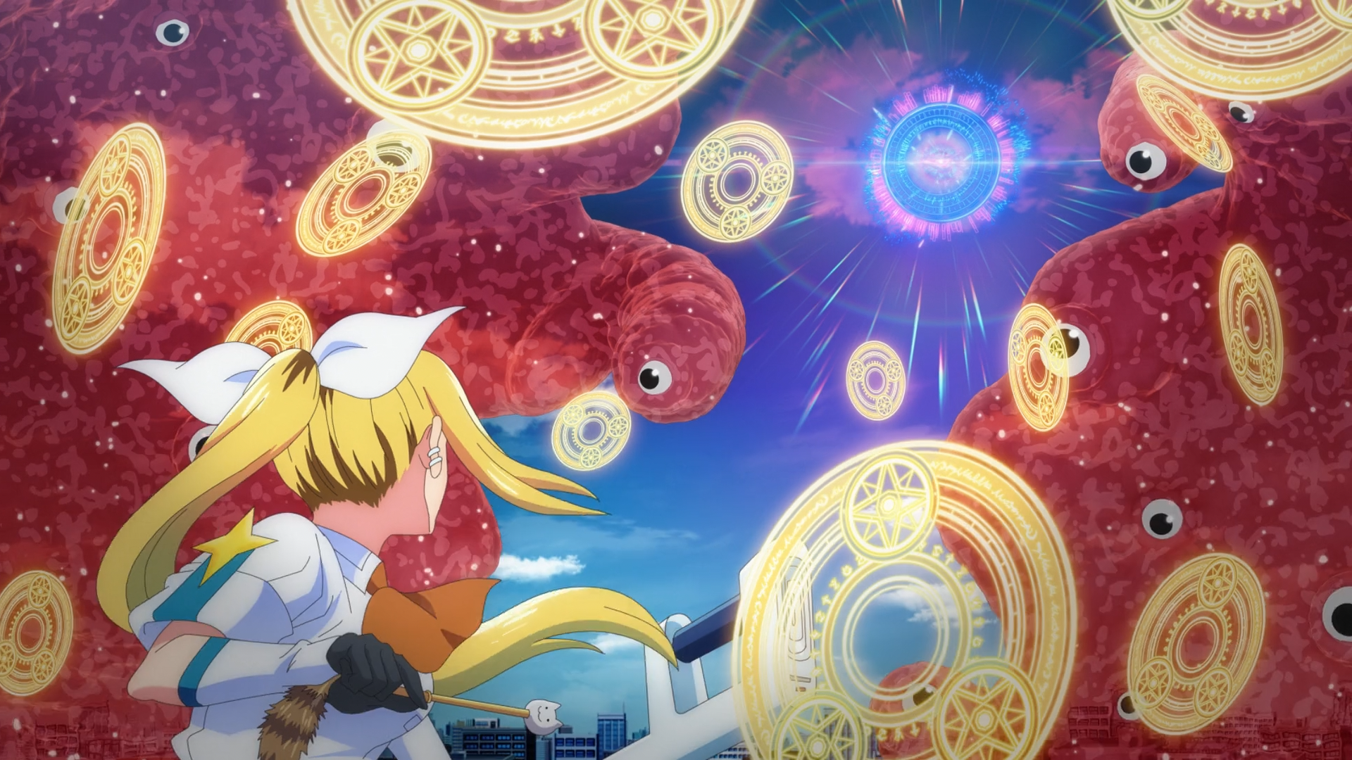 Today, Kana’s first mission involved assisting Hitomi with a Structural Parasite that has taken over an entire floor of a build. Since the Kaii has gotten out of hand, Hitomi and the others didn’t feel it was safe for Kana to participate in the fight just yet (especially since she has yet to even practice cast magic). However Kana took it upon herself to come to Hitomi’s aid when she noticed that Hitomi’s BROOM was malfunctioning. It had a crack, and not only was the magic power leaking out, but it also was struggling to hold the weight of two people. And to make matters worse, the BROOM she was using was an outdated model, a temporary replacement due to her last one that was destroyed in the beginning of the first episode. With the permission of Boss Man, Kana took a leap of faith in herself of believing she can pull off casting a magic spell to blast the Kaii based on the literal instructions she memorized from the manual.