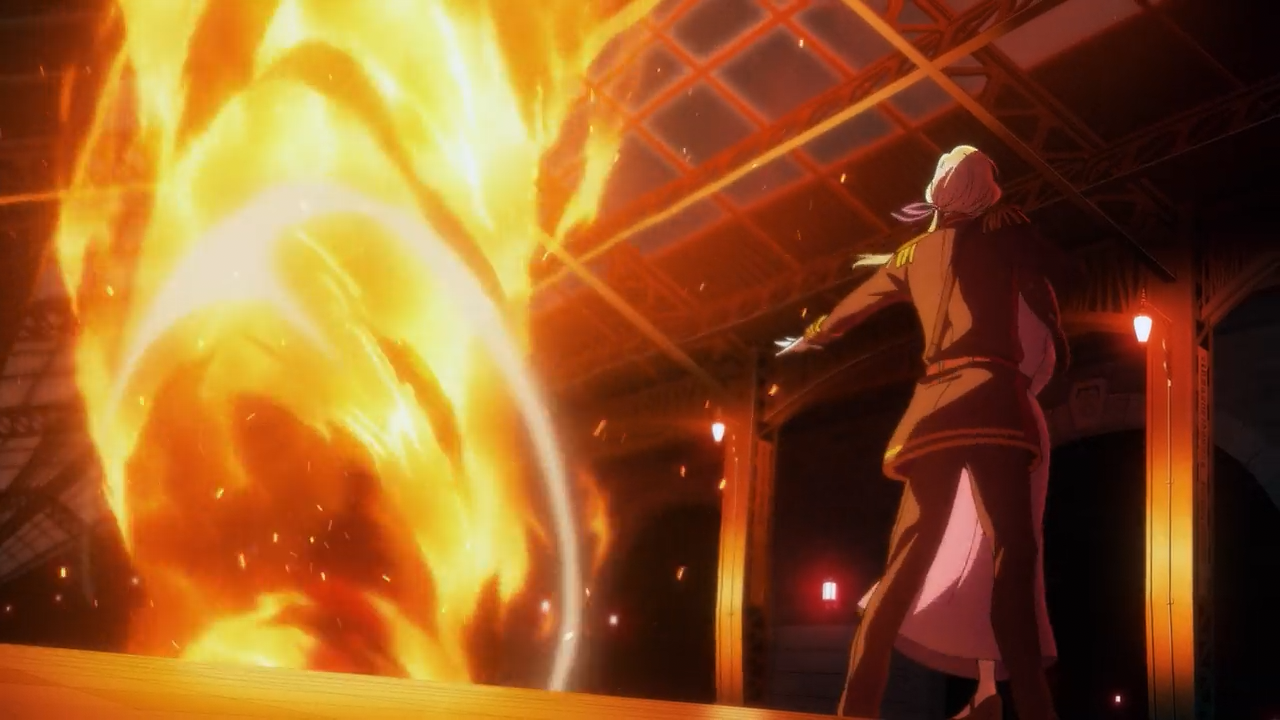 Let’s start with Naoshi’s greetings. This might seem as a trivial thing, but I was frustrated that they cut out Naoshi’s entire provoking dialogue exchange with Kiyoka that involved breaking the news to him that Godou and his unit had fallen into a terrible trap. Instead the direction they opted to go with came off was so cheesy I actually cringed, in what should’ve been a more tense situation. And not only that, but the novel did a much better job at SHOWING the way Naoshi’s abilities of messing with one’s senses (Kiyoka trying to grab Naoshi but couldn’t), compared to what we got, which as just manipulating the way they portrayed the space around them and Kiyoka and Arata getting absolutely bamboozled by it. They also chose to have Kiyoka use his power instead of Arata using his gun, (though in retrospect, both cases could’ve actually injured an innocent bystander instead. I mean, did you see that scorch mark on the ground?) Nevertheless, for Kiyoka specifically to use his power that recklessly in such a public space was a rather uncharacteristic move on his part. He was far more reserved with his actions against Naoshi in the novel, choosing to withdraw his sword over using his powers.