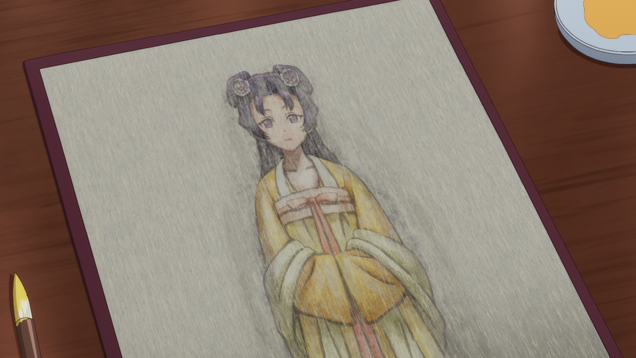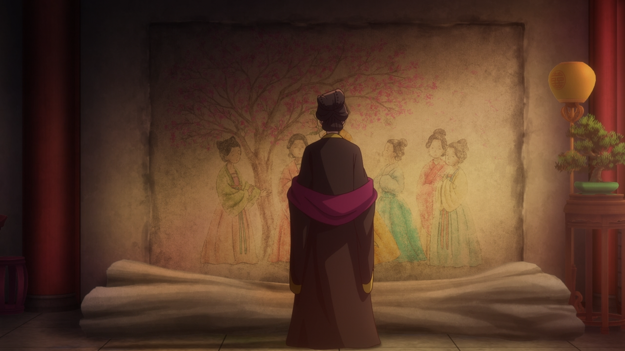 Anyways, Maomao was able to clear up that no, Anshi didn’t curse the guy. He very likely died because he had been using orpiment for his paintings (which is nobody was aware at the time, to be poisonous to the body). Maomao had also discovered uncovered layers of wall paintings, but the one that she had found was none other than a portrait of mature Anshi and the young concubines of the rear palace. While Anshi wasn’t certain of it herself, Jinshi at the very least believed that the yellow proved that was Anshi. It has always been her favourite color for garments, which further proved the late emperor didn’t forget Anshi.