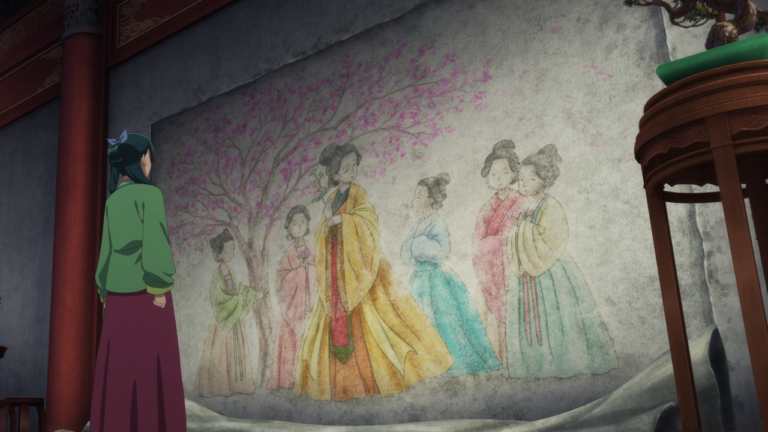 Anyways, Maomao was able to clear up that no, Anshi didn’t curse the guy. He very likely died because he had been using orpiment for his paintings (which is nobody was aware at the time, to be poisonous to the body). Maomao had also discovered uncovered layers of wall paintings, but the one that she had found was none other than a portrait of mature Anshi and the young concubines of the rear palace. While Anshi wasn’t certain of it herself, Jinshi at the very least believed that the yellow proved that was Anshi. It has always been her favourite color for garments, which further proved the late emperor didn’t forget Anshi.