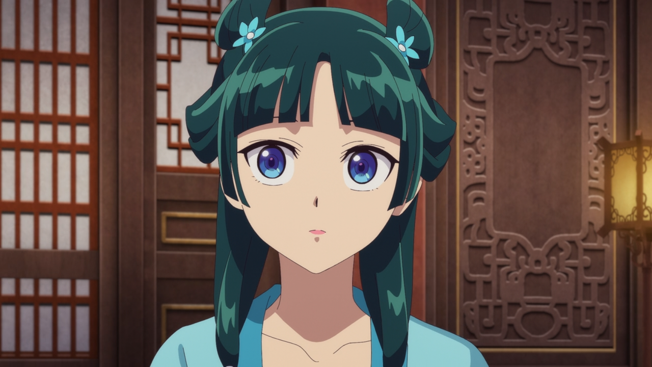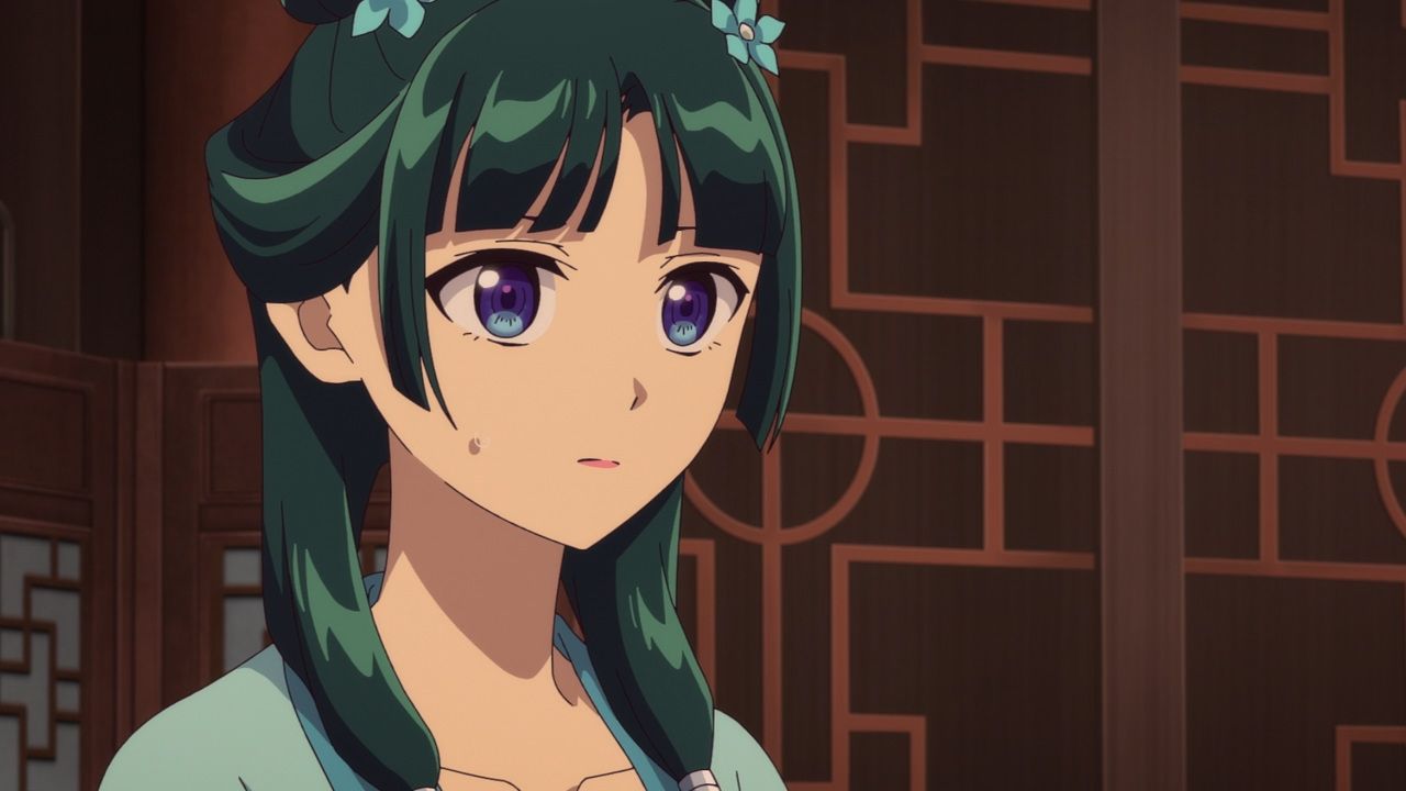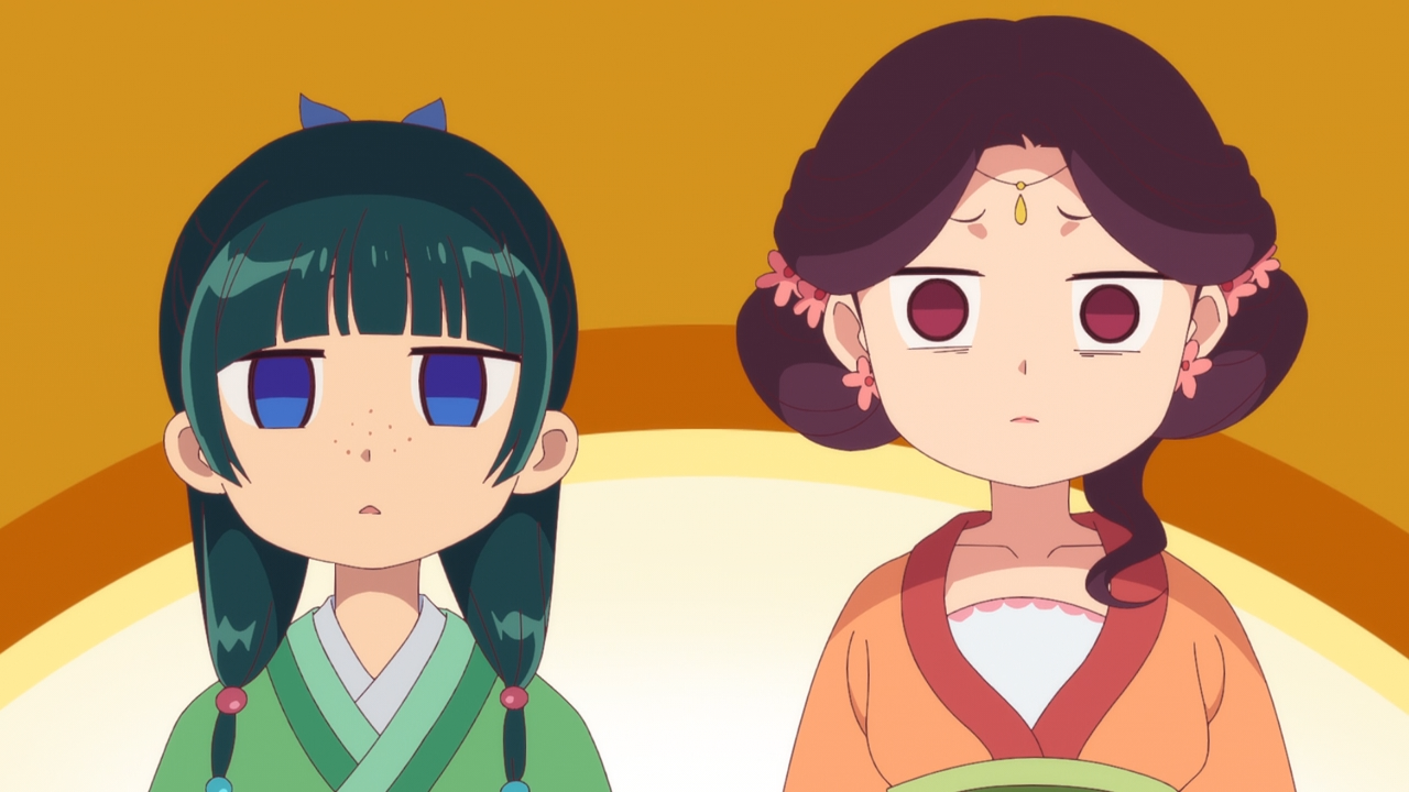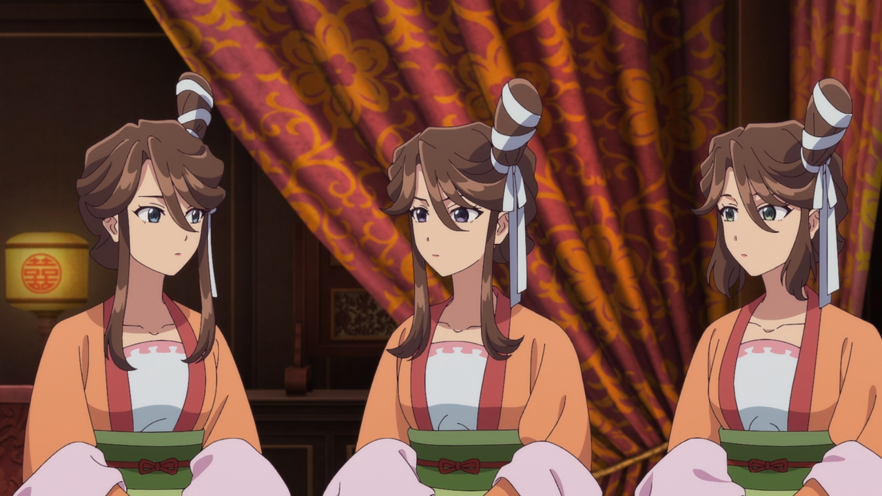 Not much too much happened in episode 10 so I’ll be brief. We were introduced to three new ladies-in-waiting to serve Lady Gyokoyou. They look so alike you could pass them off as triplets. But there are subtle details to tell them apart, notably with their eye colors and hair styles. However it’s difficult for Maomao to remember who’s who, so they’ve volunteered to wear specific colored ribbons so she could at least have a color-code reference.