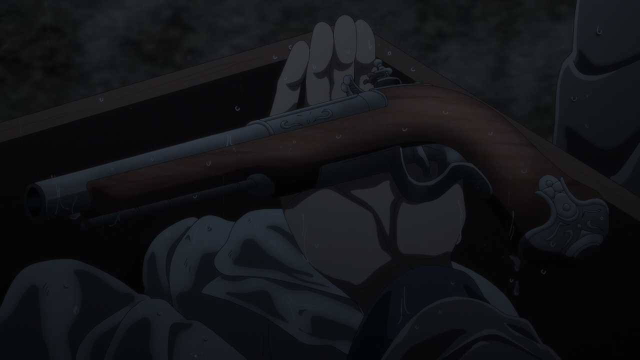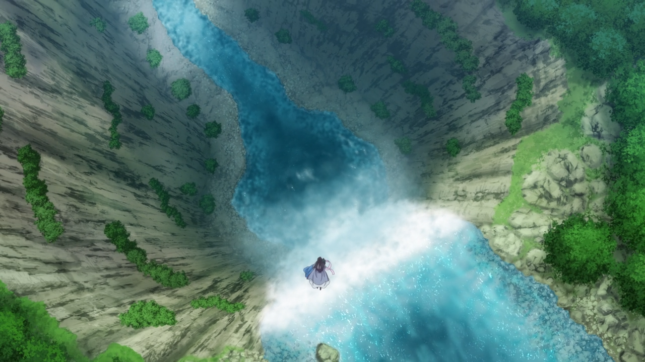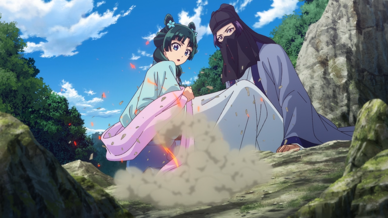 But as much as Jinshi tried to play it cool in public, it’s not easy to resist ripping off the mask just to breathe or get a drink for sanity sake. Maomao noticed during the banquet that he was showing signs of hydration, and wanted to act quickly to help him. She couldn’t do anything until he was able to get away, but even then he was so guarded that he didn’t feel it was safe enough to take the mask off outside of the banquet. Maomao had thought they should go further out so that he could, but unbeknownst to her at the time, it just left them vulnerable to being shot at by assassins wielding a Feifa. So much for catching their breaths, because the next thing she knew, Jinshi had plunged them into the waterfall to escape, and Maomao lost some of the stuff she had brought along with her for him. Ironically only after that they were actually able to have a collective breather (quite literally, if I may add).