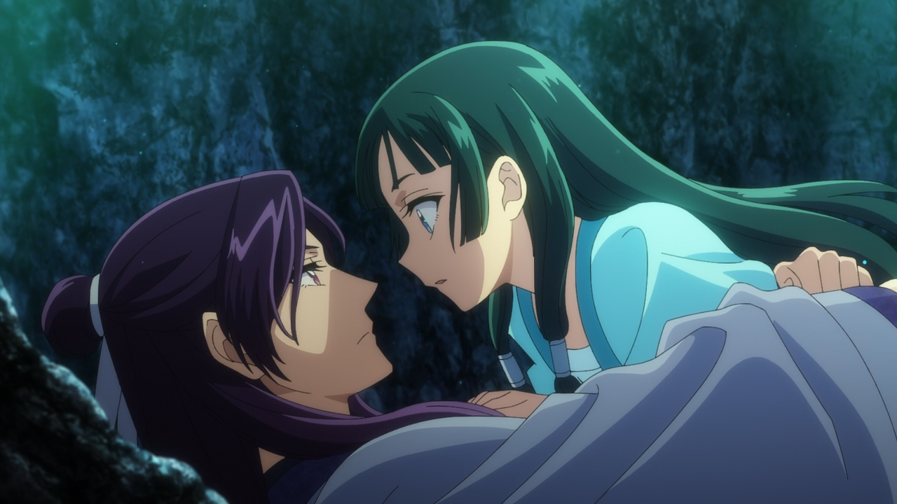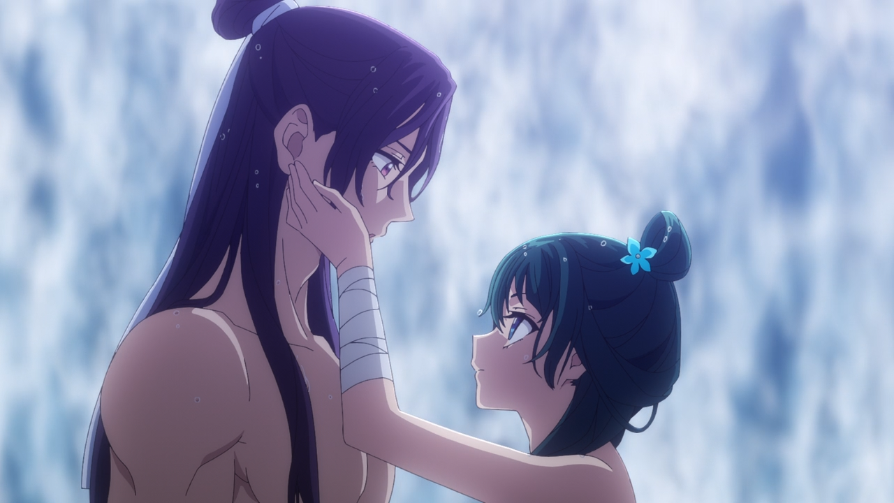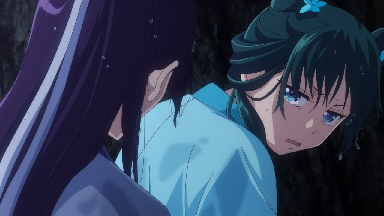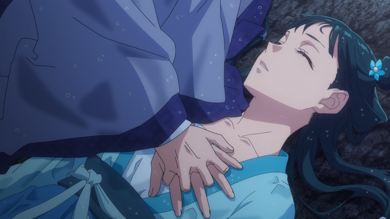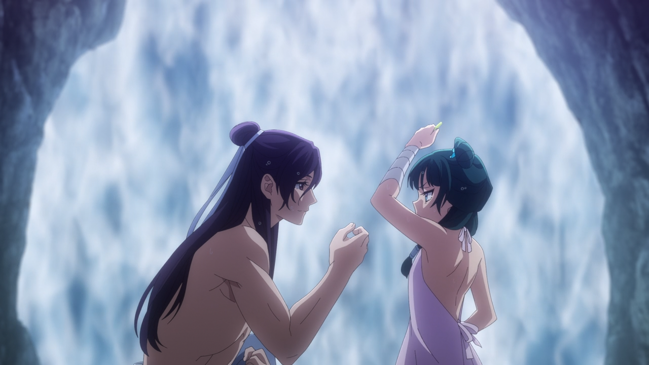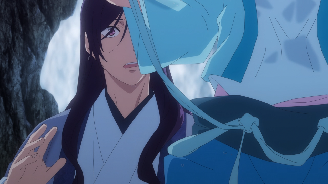 They almost managed to succeed, but their attempts were thwarted when a freaking frog jumped on Maomao’s face. Honestly impressive that she didn’t even flinch at that, and instead just tried to shake it off. But that wasn’t really the smartest idea since that caused her to lose the grip on the already slippery surface, and she went tumbling down onto Jinshi. Now they find themselves in quite an intimately tangled situation, and clearly Jinshi’s not about to let go of the prime opportunity to tell her the truth! Ribbit~!