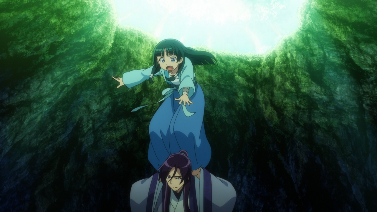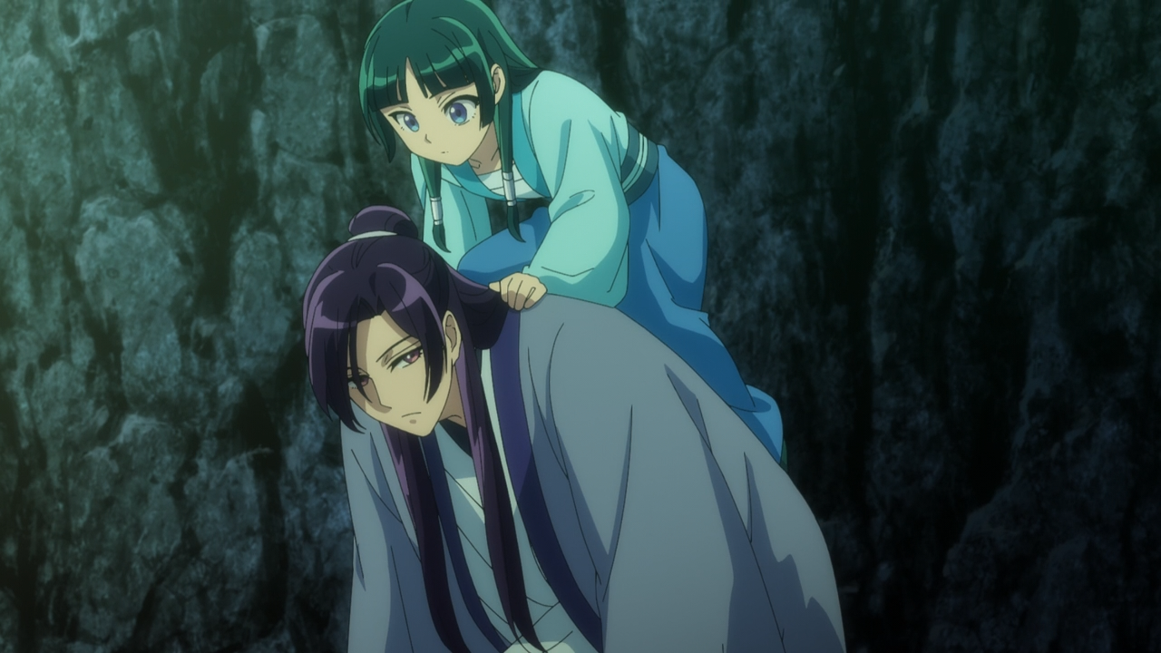 Another fun moment was when they worked together to try and reach climbing out of the hole to exit the cave. Jinshi was like: ‘Climb on my back’, leaving no room for debate. Of course Maomao as per usual was being mindful of their status (especially when she was thinking about how Suiren would react if she knew), but reluctantly agreed since yes, she’d most definitely be crushed under his weight!