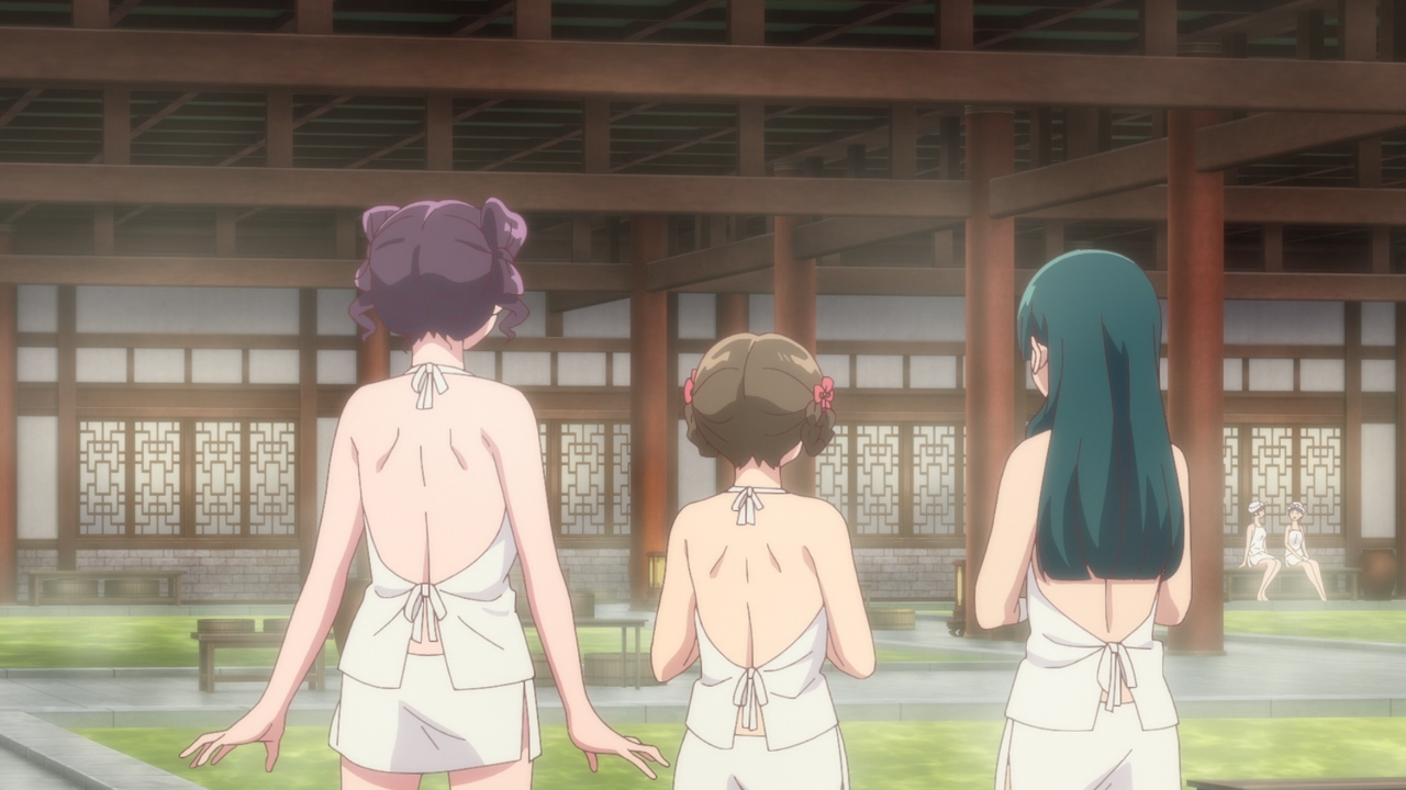 Xiaolan has found herself in a pickle of looking for a new place to work once her term of service is up in six months. She doesn’t have a network, and Maomao’s mostly limited to only recommending the Verdegis House as an absolute last resort. She’s kind of avoiding Jinshi at the moment, but she has a valid reasons for not wanting Xiaolan getting dragged into any troubles. Thankfully Shisui had a solution to this problem, and that’s introducing them to the best place to network — the consorts’ baths.