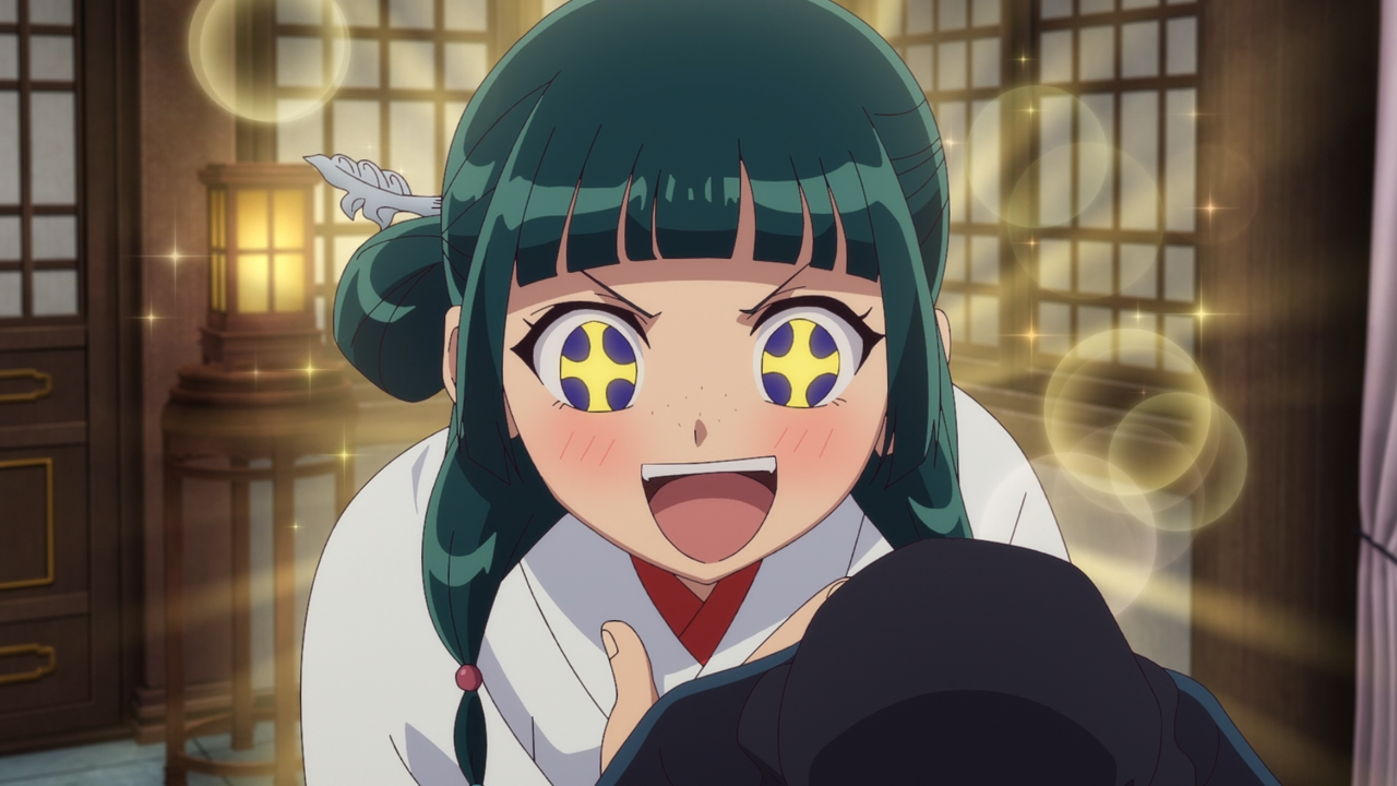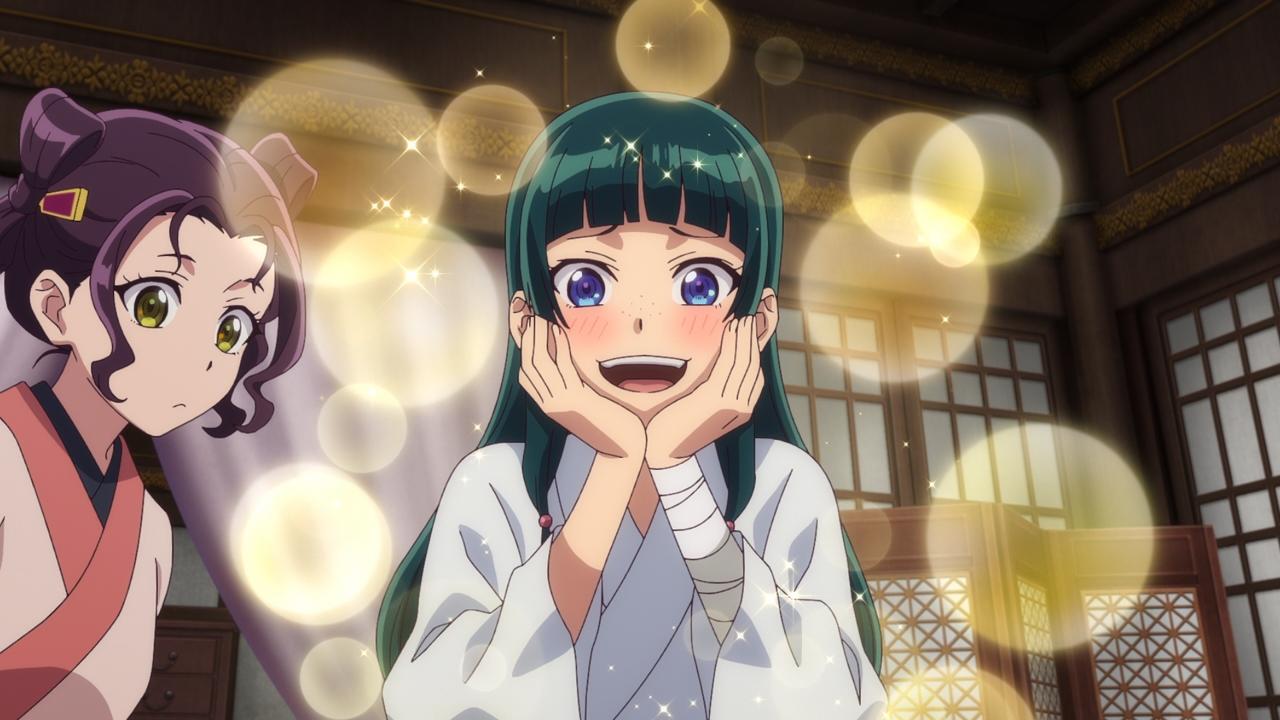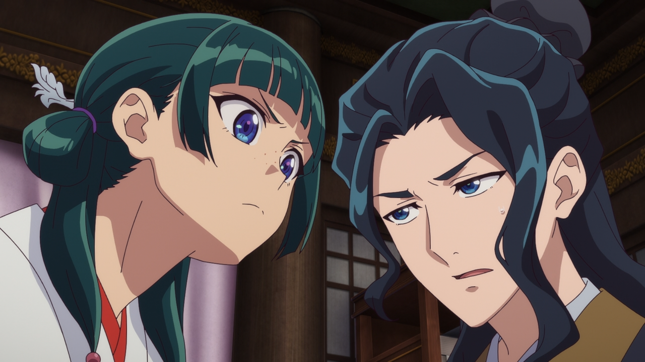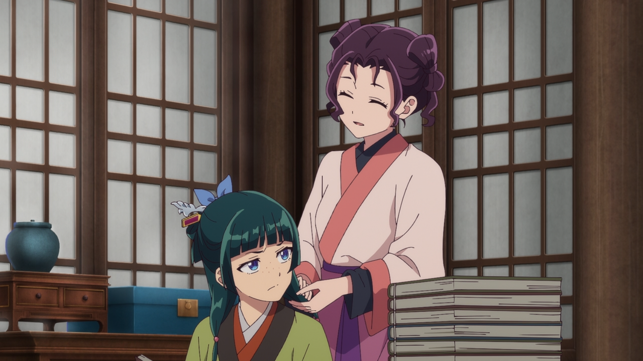 Apart from that, it was fun to see Maomao go back to her typical eccentric apotheycary-nerd self again. As soon as she got the green-light from Suirei to start learning about the secrets behind the ‘resurrection’ medicine’s, all sense of self-preservation as out the window. Here Suirei was trying to tell Maomao about some of the dangerous side affects, such as paraylsis, scarring and even losing memories– and Maomao’s response to that is: ‘PLEASE USE ME (AS YOUR TEST SUBJECT)!’ She can say whatever she wants about Master Lakan, but she absolutely got this side of “obsessive fixation” from him, hahahahaha! It only became even truer to that when Maomao was so locked in to reading the books Suirei gave her (to keep her preoccupied while she and Shisui had to take care of other concerning matters), that Suirei took it upon herself to get her cleaned up in the morning.
