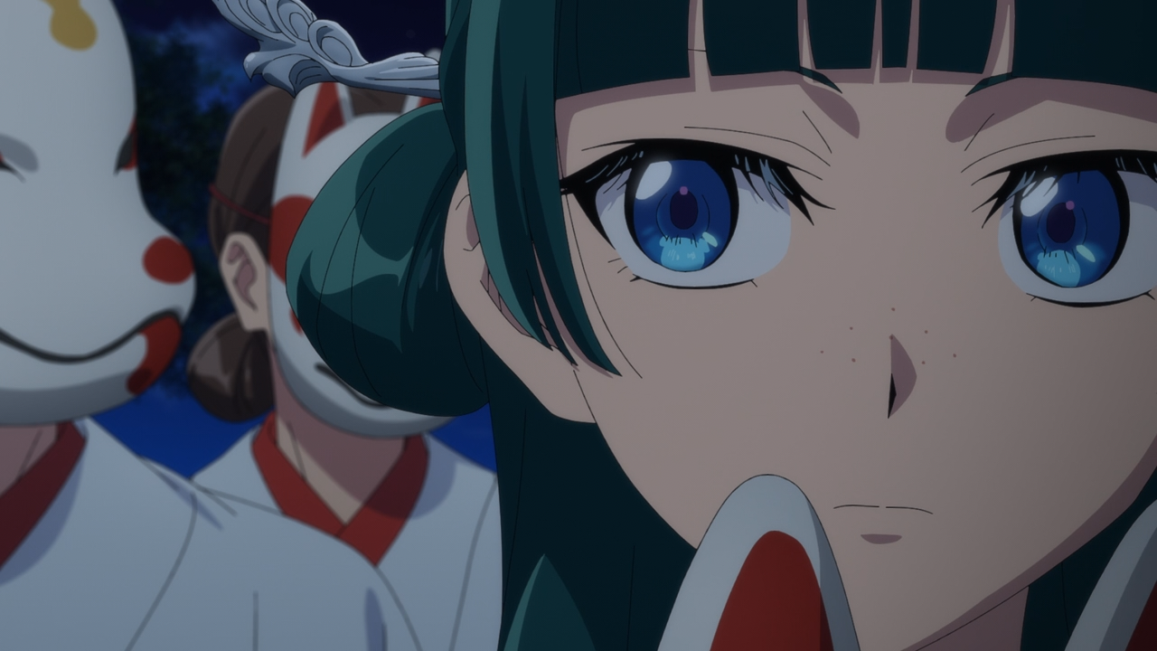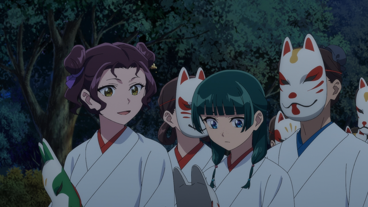 The fox masks are painted white to reflect the foxes (native to the area), and then adorned with colors, typically red but also green to reflect the newcomers that settle in the region. Shisui also made a point that many of the men in their village have trouble differentiating colours, so some they painted green around the eyes instead of red (as you can reacall: Master Lakan’s color blindness test with the wine, suggesting it’s red when it’s actually green). So Maomao’s thoughts about how the white foxes were a ‘pretext’ for white skin (hence ‘people of the white fox’), and the paint colors changing reflecting intermarriage made her think back to the Shrine of Choosing actually shows she was connecting the dots that circles back to the tale of The Mother Royal. Thus Maomao concluded they’ve must have been the same group of people who came from the West.