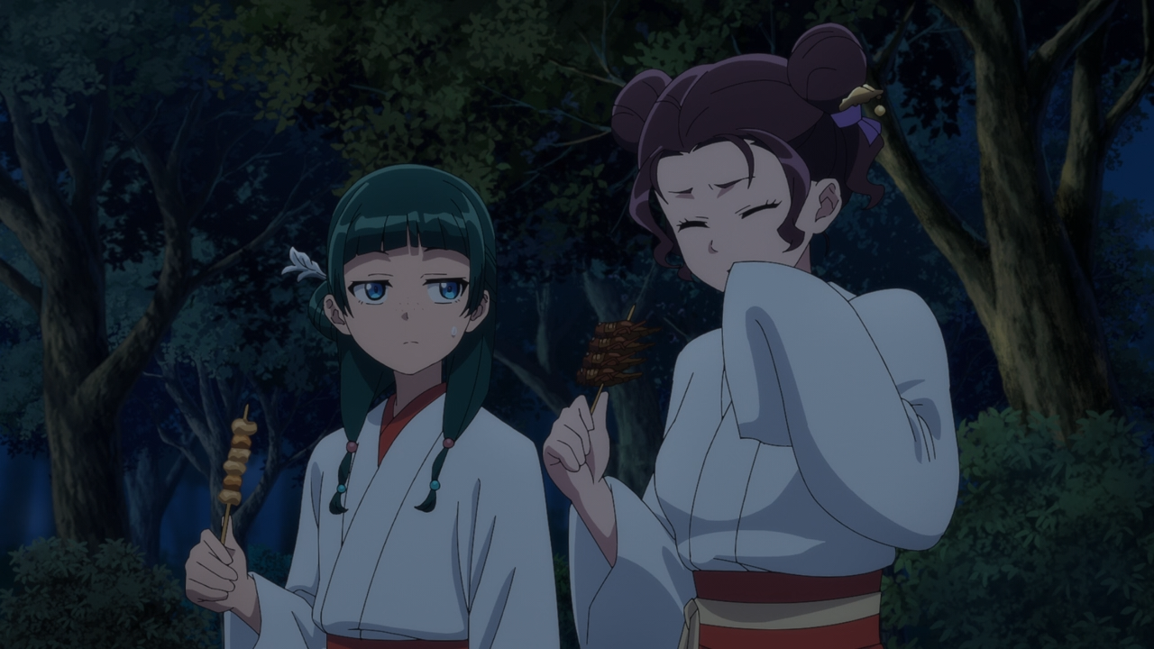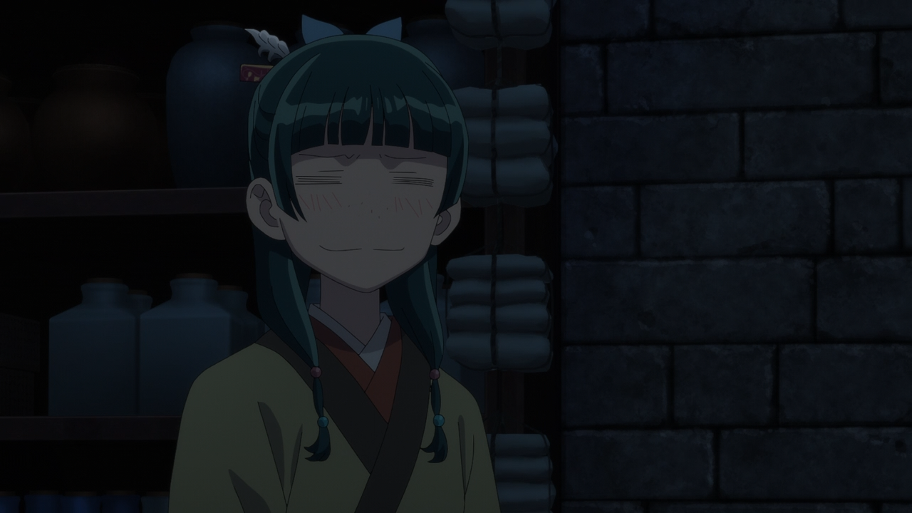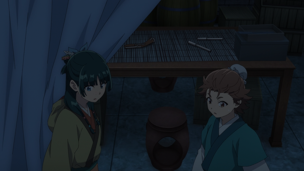 Not even a minute after Shisui left, Maomao looked outside and thought: Oh that field looks interesting! I wanna check it out! Add Kyo-u into the mix and the next thing we know, the two of them are walking out of the gate and breaking into the store house in question. And the next thing they know, they’ve walked into something very different and far more dangerous than what they bargained for.