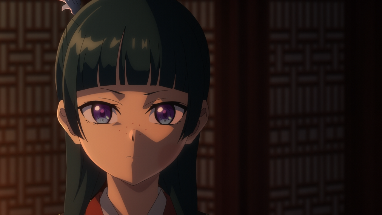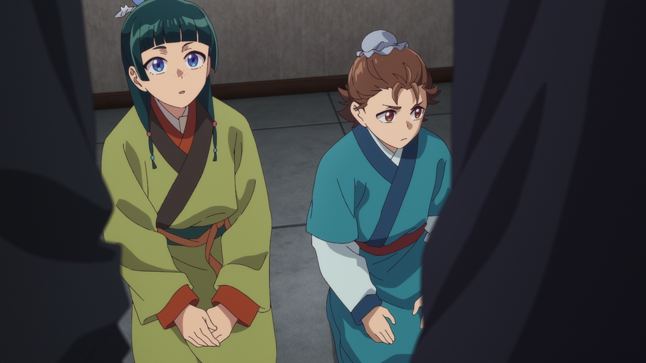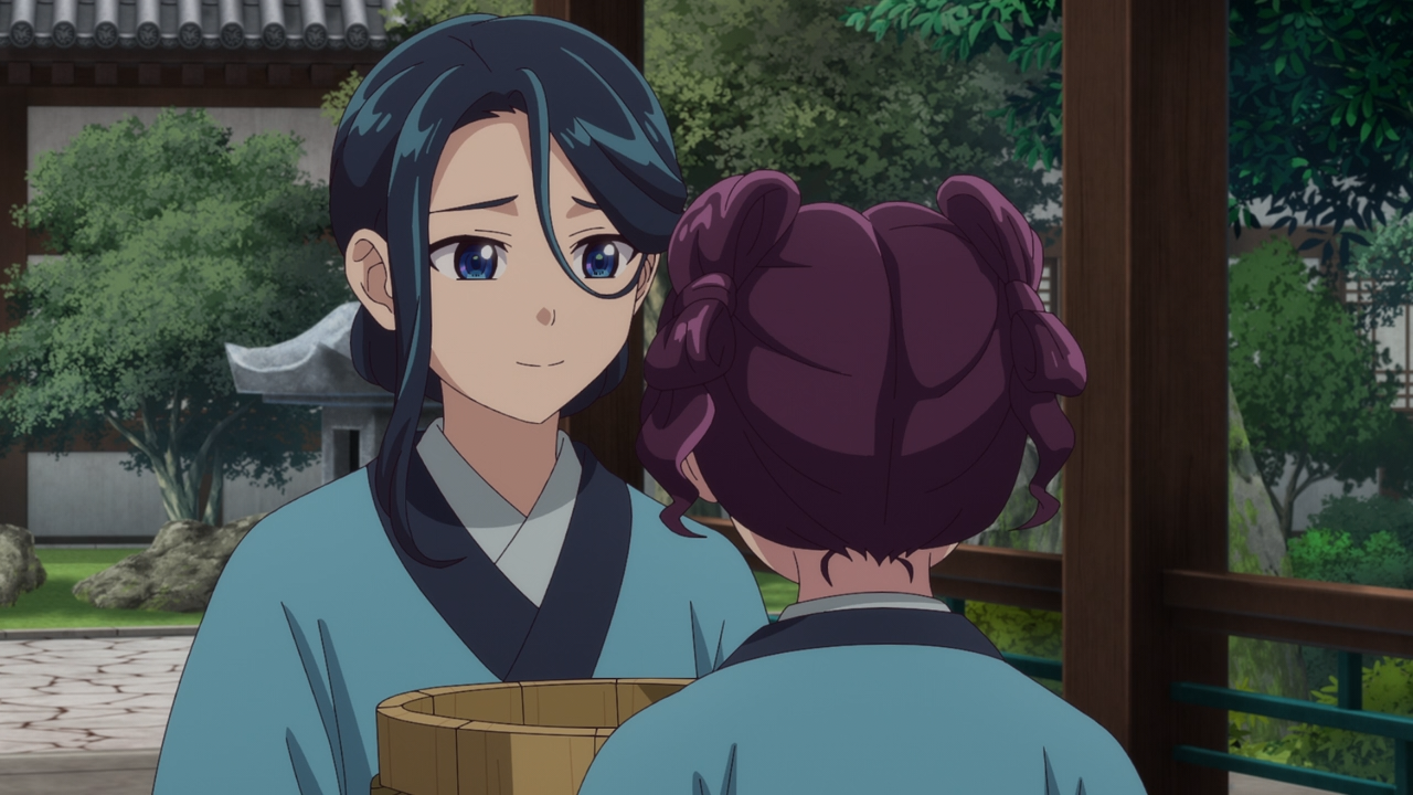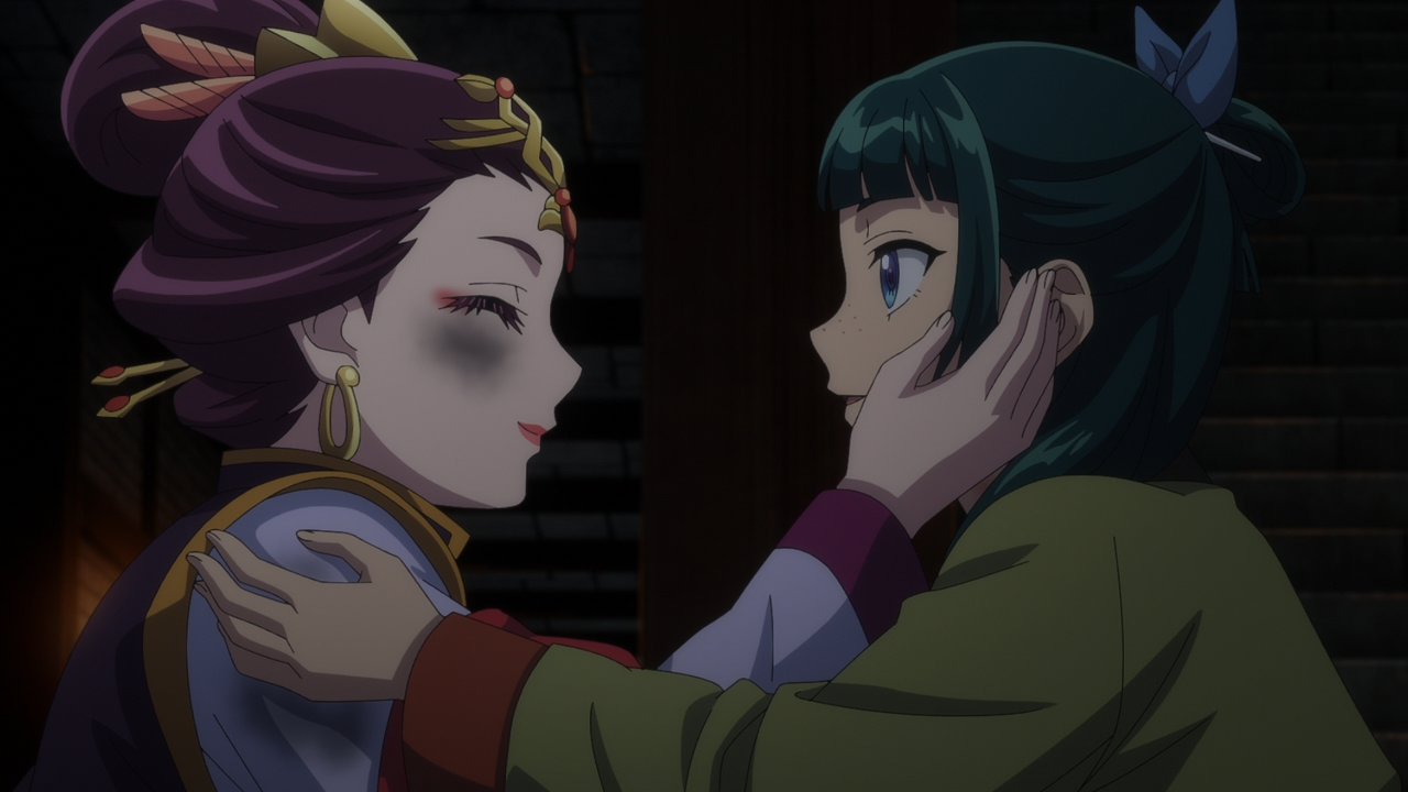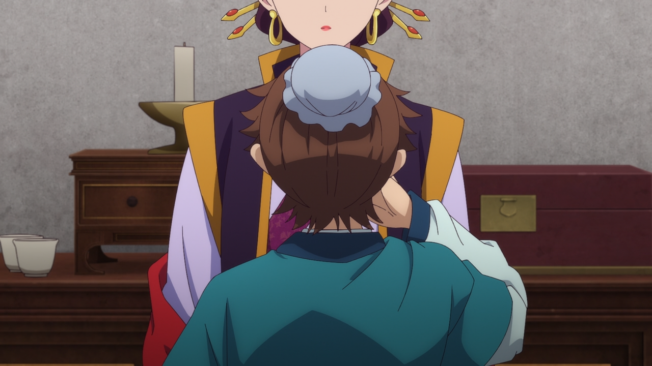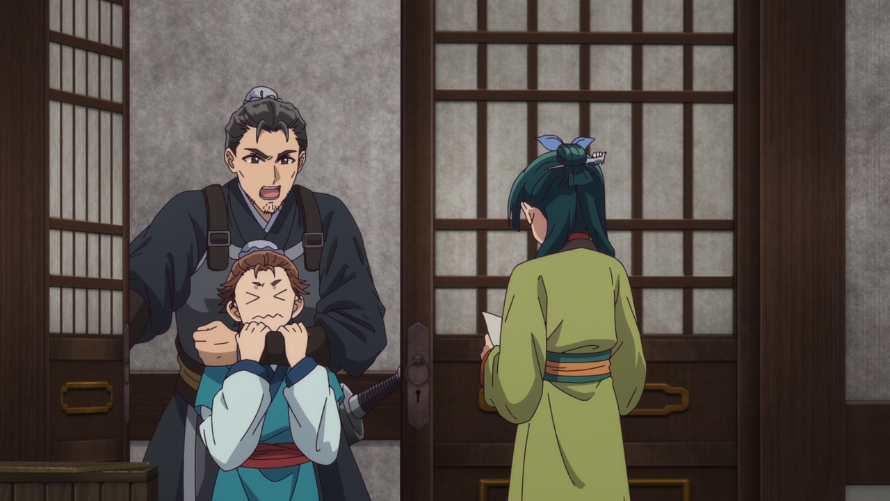 Things were originally going to go south real fast when Shenmei walked into the scene where Maomao when Kyou-u had been caught by the guard trying to help Maomao escape, and Suirei was trying to defuse the situation before Shenmei caught wind of it. Unfortunately because she did that Suirei, the guard and Kyou-u were going to be cruelly punished for it (hell Suirei already been beaten several times just for speaking up trying to protect Kyou-u). Maomao knows all too well when to keep her head down, but when she sees such disgusting injustice– she can’t stay quiet about that. So the most courageous thing she did was not only speak up, but deliberately provoke a dangerous woman like Shenmei by calling her an ‘Old Hag’ all for the sake of a guard she doesn’t even know, and Kyou-u, who had earnestly tried to help her escape. And boy did she take a hefty hit– she was smacked in the face with her fan.