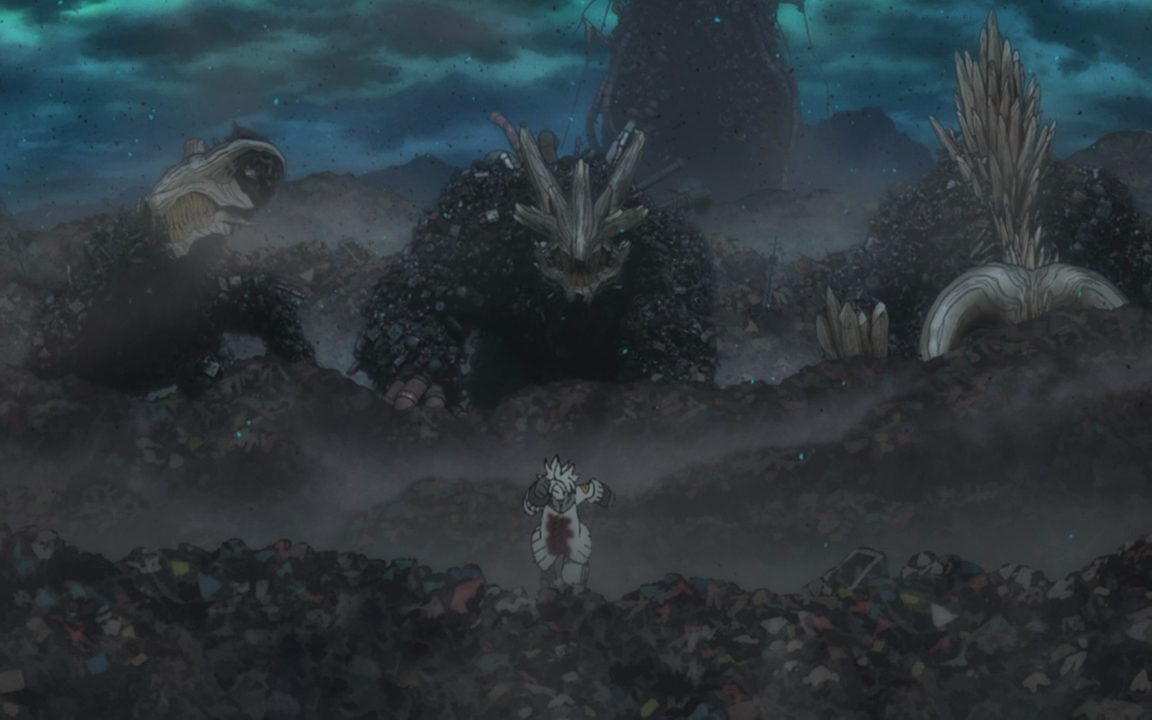 The more I watch this series, the more ridiculously edgy I am finding it lol. However, it is a very interesting watch so I feel like I’ll stick with it for the long run. Especially since I recently found out this series will be 24 eps long, but I’m here for the ride. This episode introduced a lot of different things such as the Pit is not actually a pit, but a separate world of sorts and the world “above” this zone is called the “Sphere.” And wow, the fact that the Sphere essentially ruined this world by just dumping their trash into this other world without a care about where it went is honestly awful. Especially when you take in consideration that their waste literally poisoned their world and created monsters because of how toxic everything became. Despite the crazed locals we meet who were planning on selling Rudo off, I really can’t blame them for their disdain towards people from the Sphere. To them, they literally are the source of their decaying world. It’s akin to a neighbor dumping all their trash (and toxic waste) into your yard without your consent. Even the air is rancid and caused Rudo to throw up blood. I cannot imagine how RANK the air must be. As someone who is extremely sensitive to smell, I probably would die if were there in seconds.