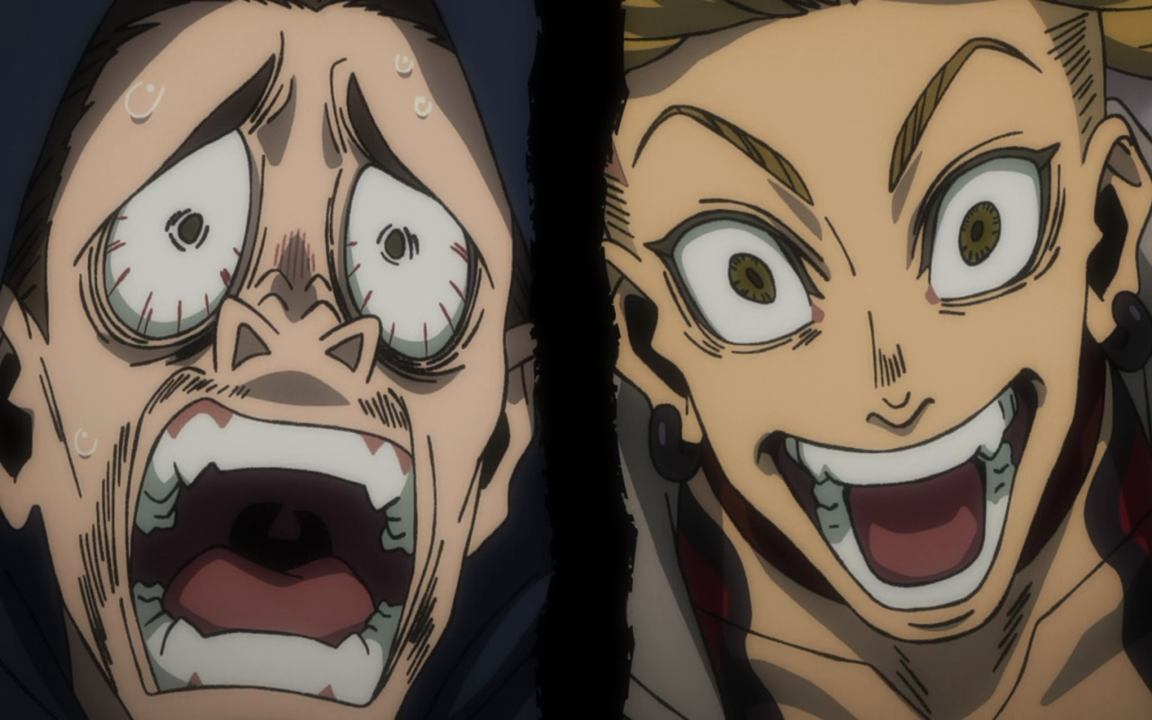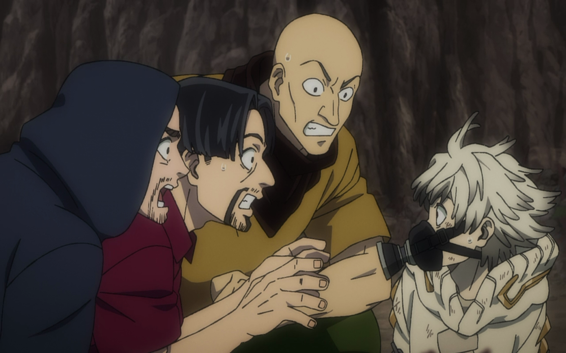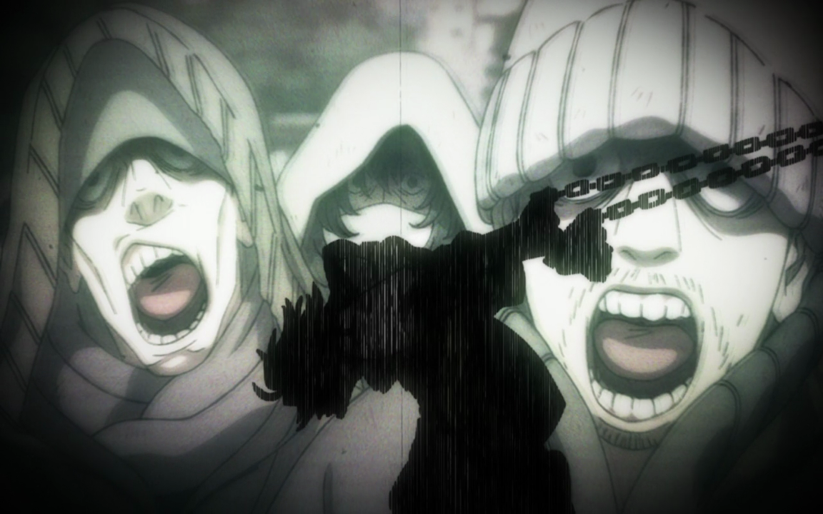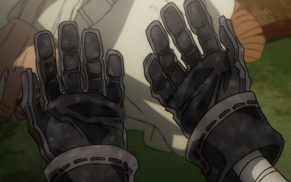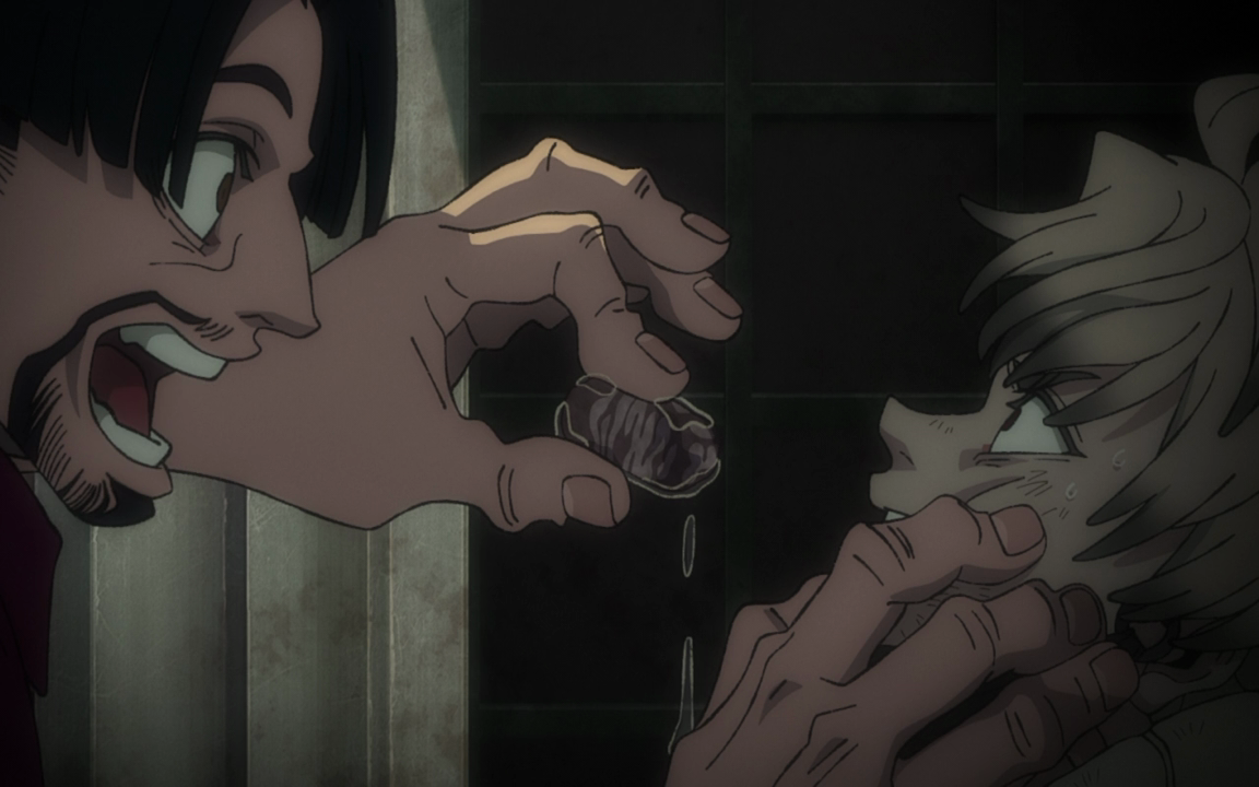 Enjin is the first main side character we see and he’s definitely shaping up to be either a mentor-figure or brother-figure for Rudo. Or both. Probably both. No one is gonna take the father-figure spot from Retgo though. And man, Enjin is literally just Tengen in a different universe. As soon as the guy started yelling, all I could hear was Tengen. I’m interested to see how he and Rudo end up bonding, even though Rudo is less than enthusiastic about being brought under his wing. His awestruck “hell no” just absolutely kills me. Sorry Rudo, you are a main shounen protagonist, it is a requirement that you be brought into an “organization.” Though I do take issue with Enjin bringing and leaving Rudo at the doorestep of some crazed locals. At first I thought they were crazy, but then was also fooled by their seemingly welcoming and good nature… only for them to immediately prove my initial feelings correct and that people really suck in this universe even if they have a right to feel disdain towards the people of the Sphere. But that doesn’t excuse their actions of trying to sell Rudo off to be tortured when they don’t even realize that he’d probably be the most sympathetic towards their situation. But man, I had to look away when Rudo ended up tearing the skin and muscle off that guy’s fingers. Hopefully things won’t be… that graphic moving forward, but for all I know, that might just be the precursor to this series. Hopefully I won’t get too disgusted.