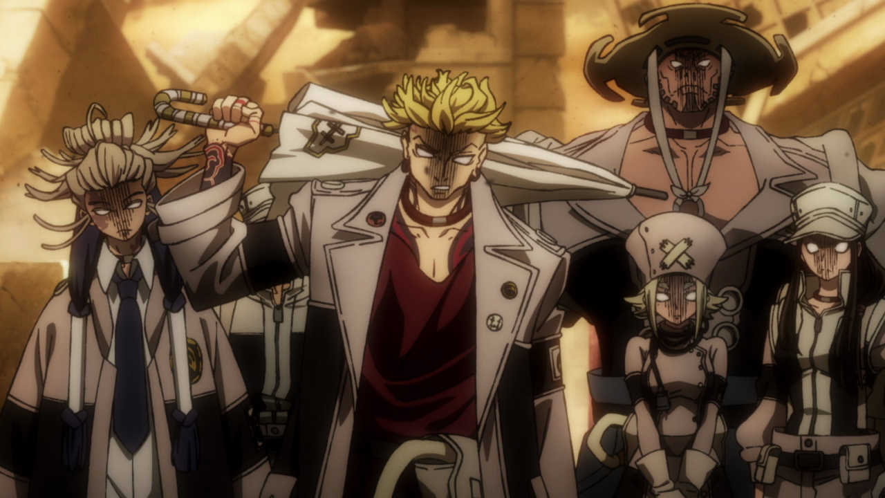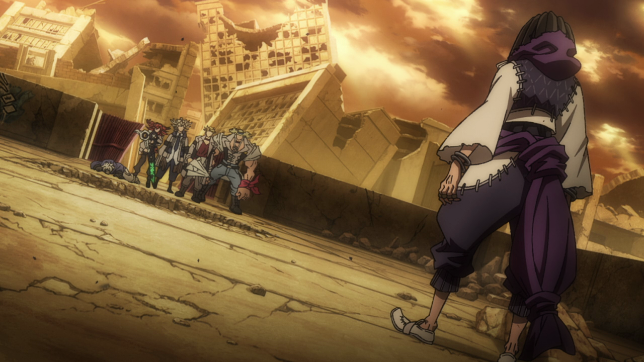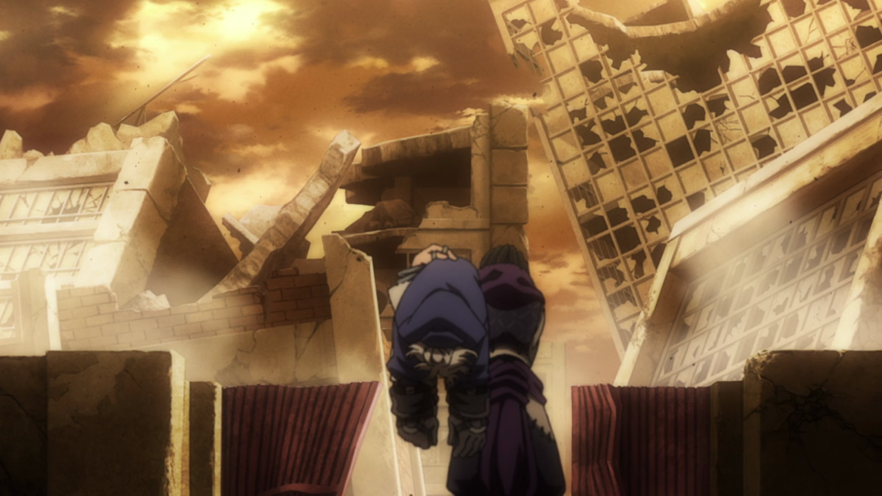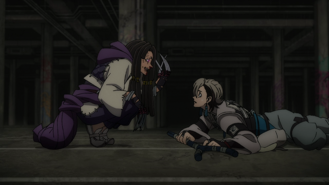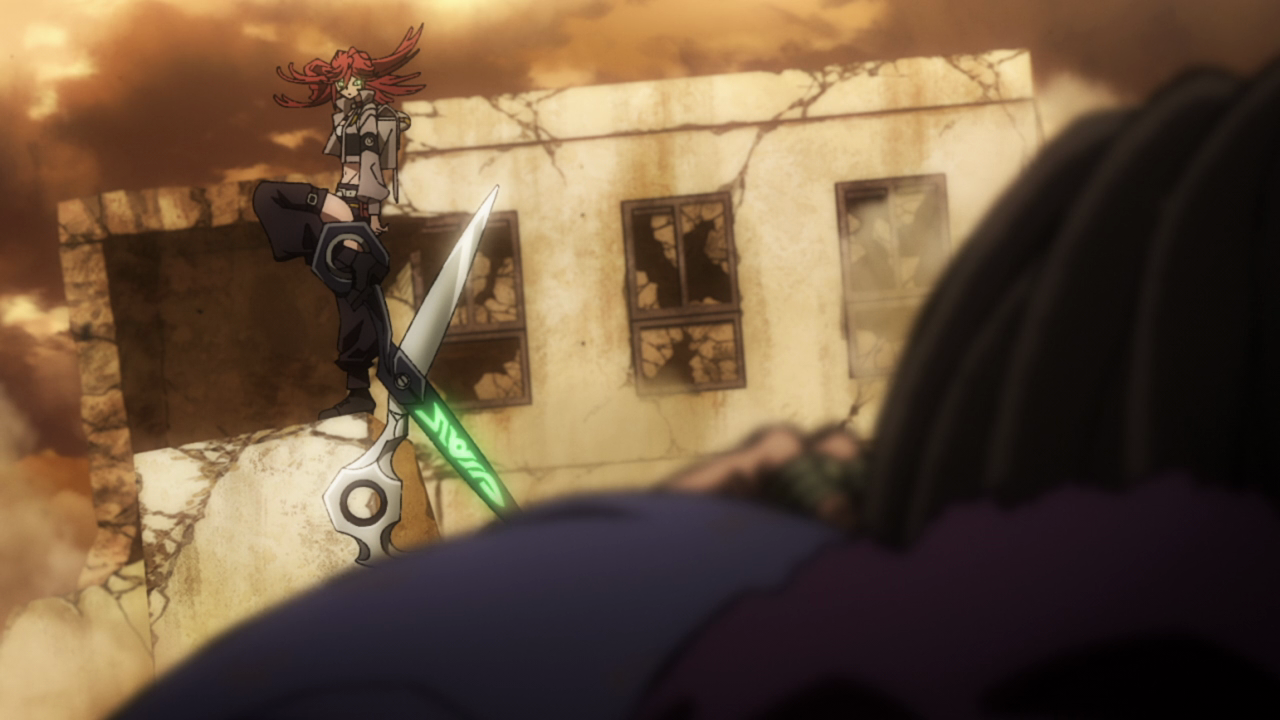 Unfortunately, being the annoying character that he is, this isn’t enough to defeat Jabber for good. Even with the great teamwork that Zanka and Rudo had, they were ill prepared to deal with a psycho like Jabber. Especially when Jabber ended up poisoning Rudo so he couldn’t move after they thought it was over. I legit was worried that Jabber actually won and would make off with Rudo in his custody. Initially I was so confused why he jumped outside and was confused why he wasn’t still in the building. Only for it to show Riyo and I was like: DID SHE CUT THE BUILDING IN HALF??? The idea of Riyo just cutting all these random buildings in half searching for them tickles me. That’s a lot of damage lol. Granted, this seems like an abandoned city, but still. I was hoping Enjin would come to the rescue and put a stop to this kidnapping and thankfully that hope came to fruition. He even brought some backup. Sadly I wasn’t treated to a Jabber beat down since he was forced to retreat by this other girl who seems to be a part of the same organization he’s a part of. Again, this series loves feeding us more things to question but hardly ever gives us any answers. Though one of the bigger questions is what did he mean by “series?” To which, I feel like that might lead us to why Regto got murdered eventually.