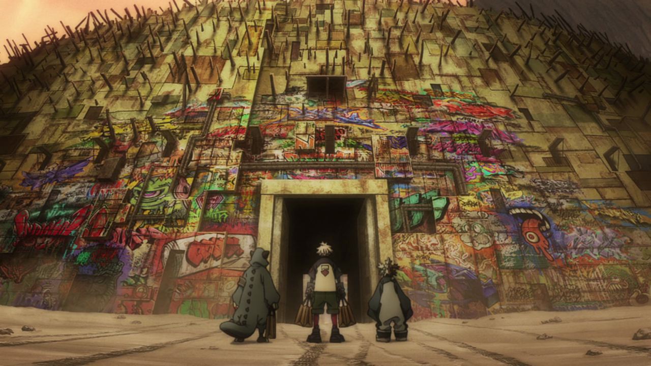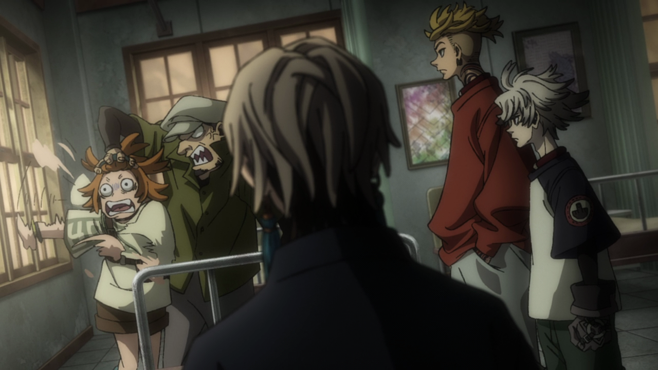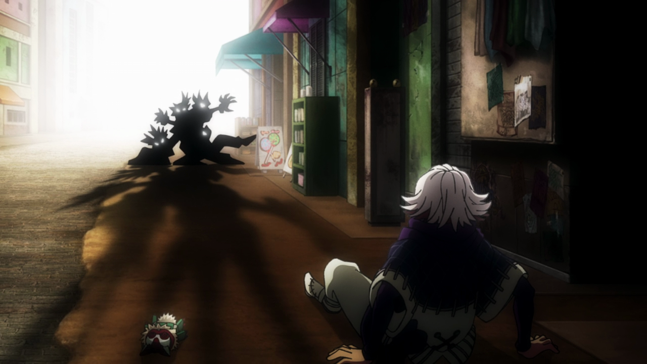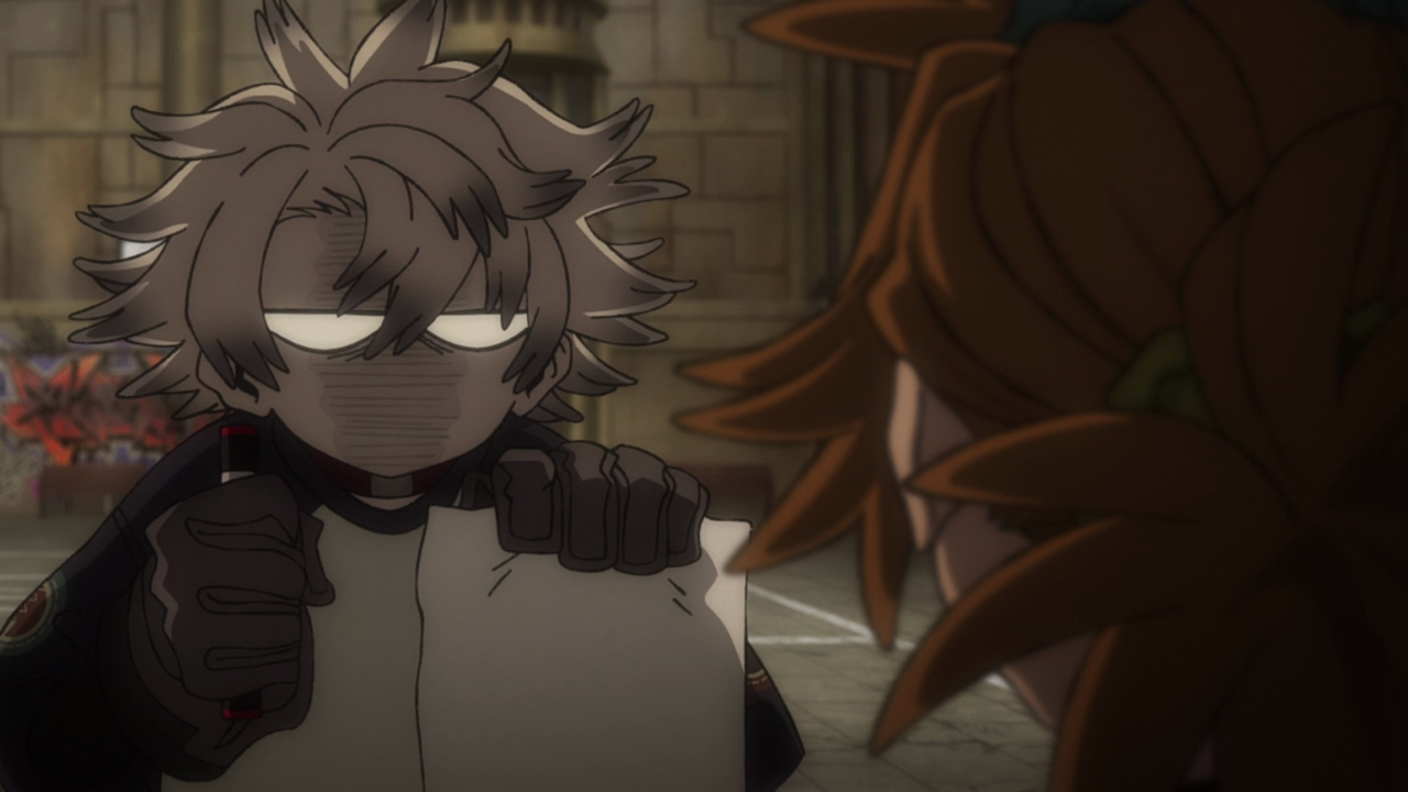 With the kids, chaos ensues. We learn a little bit on the tradition of the Spellcasters making a mural that is special to each one in Canvas Town and how Remlin is preparing to leave their mark on it. Now tasked with getting the necessary equipment and materials to do the mural, the kids inevitably get distracted. In kids I mean specifically Rudo. This guy has an insatiable appetite for sweets so of course he’d get sidetracked by it. He truly is an addict lol. And while it seems so crazy and out of pocket, it’s yet another example of allowing Rudo to be a kid with others. We then have Fu tailing them, seemingly wanting to join the Cleaners since he most likely can’t return back to the Raiders after contributing nothing to their mission. We get a closer look at who Fu was talking to back on the Trash Beast and it’s definitely pretty eerie that it’s a doll who he refers to as Master Hii. And just like everything else in this God-forsaken series, we have absolutely no clue how he survived getting off the Trash Beast, what his powers are and what in the world is Hii and why can it talk. But man, this kid is literally the embodiment of a jellyfish as he has no spine. Clearly he wasn’t cut out to be a Raider and it would make a lot of sense for him to switch over to the Cleaners. Poor dude probably just wants a place to belong, but too bad Rudo and Remlin essentially scared him off unintentionally by being feral menaces lol. That whole scene was just outrageously hilarious with how over the top it was. From Rudo kicking the kidnapper in SEVEN different frames (10 if you count the split screens lolololol) to him projecting his rage into the sky and blasting a hole in the clouds. That shot of Fu being blasted by the aftershocks with the shining music had me ROLLING. Better luck next time Fu.