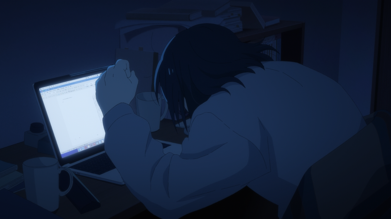 I do wonder what made Makio to go red in the face though. I think it was because she got second hand embarrassment (because it made her think back at her fresh days writing in her youth) or it actually made her flustered. She honestly didn’t know how to exactly to critique Asa, just as Asa didn’t know what she was really hoping to get out of it besides maybe “It’s good!”. The only feedback Makio gave her was the following; hone in on a subject and the intent of the song, it’s too vague and all over the place. Use the bridge to expand on those points, add more vocabulary, and most importantly: Write with the intent to kill, like her life is on the line. Asa still didn’t get what she meant in this moment, but we do hear her narration that she eventually comes to realize what Makio was getting at here.