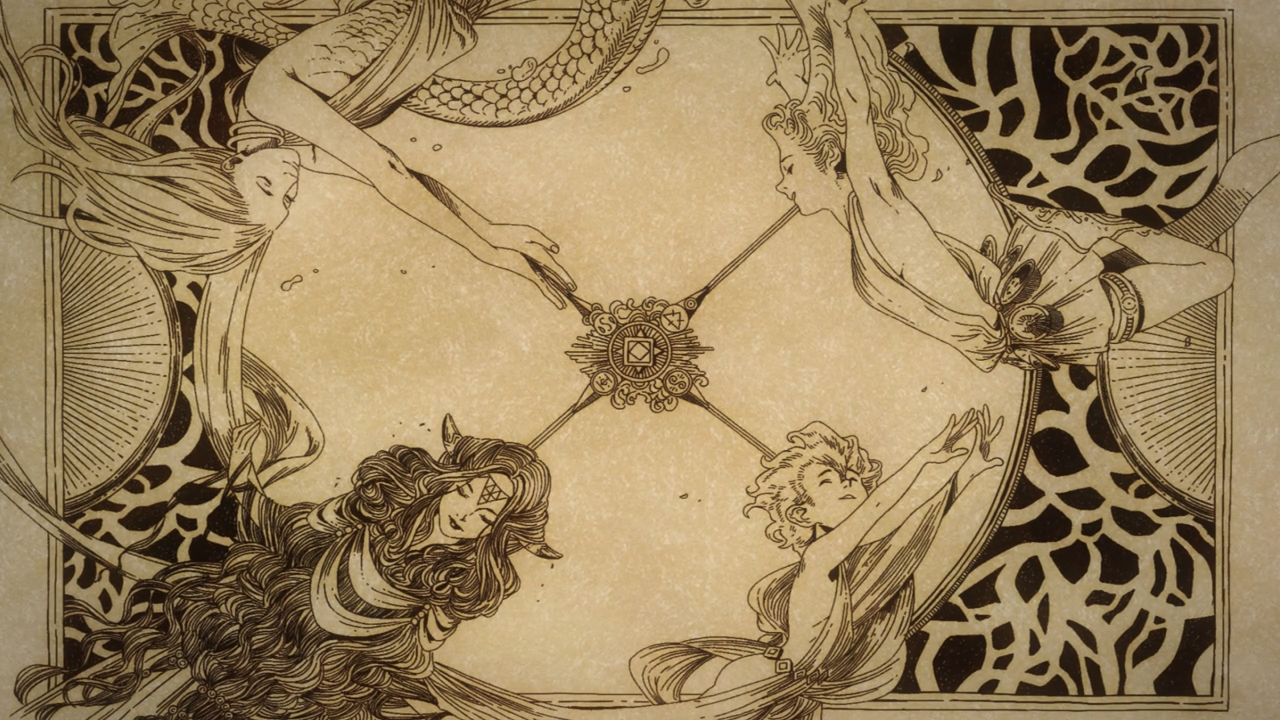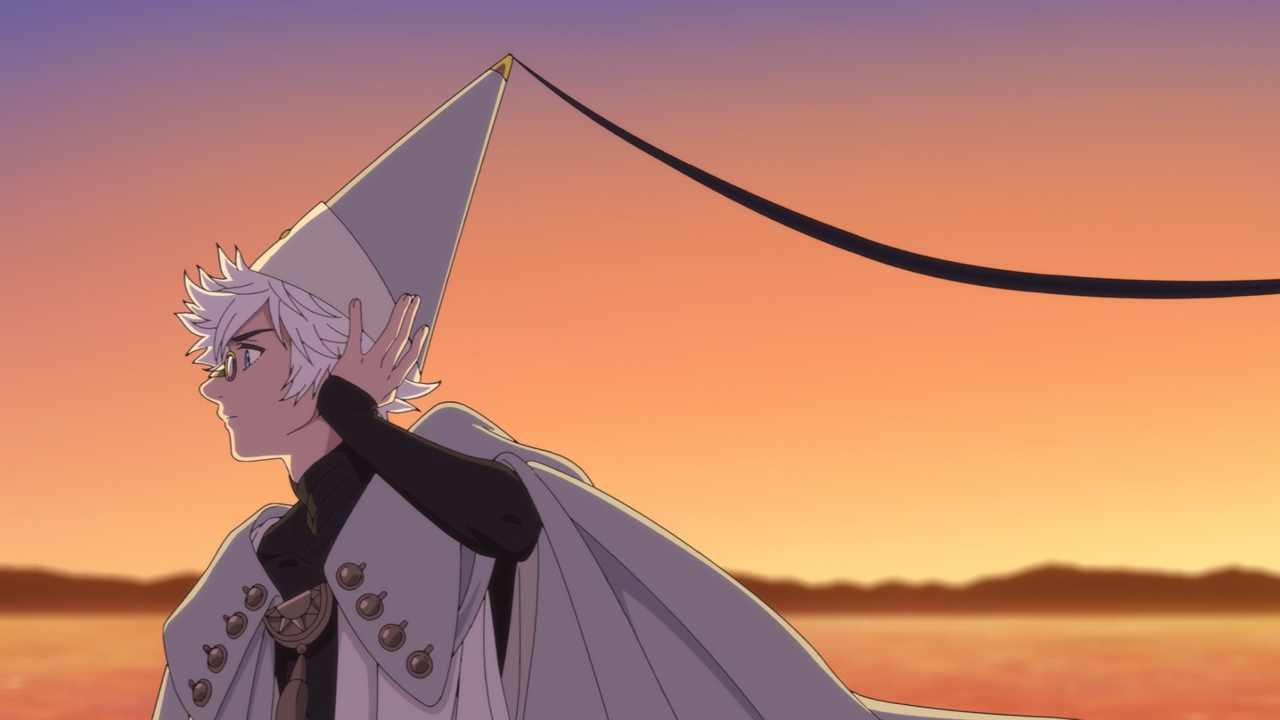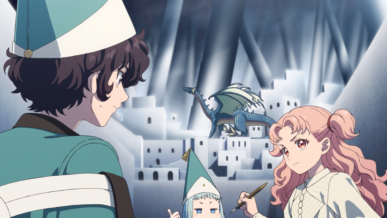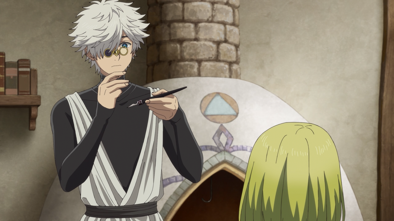 Apart from the present crisis the girls have run into, this week they did talk about switching up Coco’s tools… Except, not with what she’s used to. In the beginning of the episode, I found that kind of surprising, but after seeing how they needed to quickly be able to draw/close spells on the fly in the labryinth, perhaps it’s just not practical tool for on-to-go purposes. The one she had been using since her arrival had been one of Qifrey’s old pens he lends to his students to start off with. But seeing that she hasn’t been able to find her stride with the clean lines, he concluded that perhaps she needs to find a pen that fits her hand better. So they went to an island in the town of Kalhn to visit the magic stationary story where she could find one that fits her better.